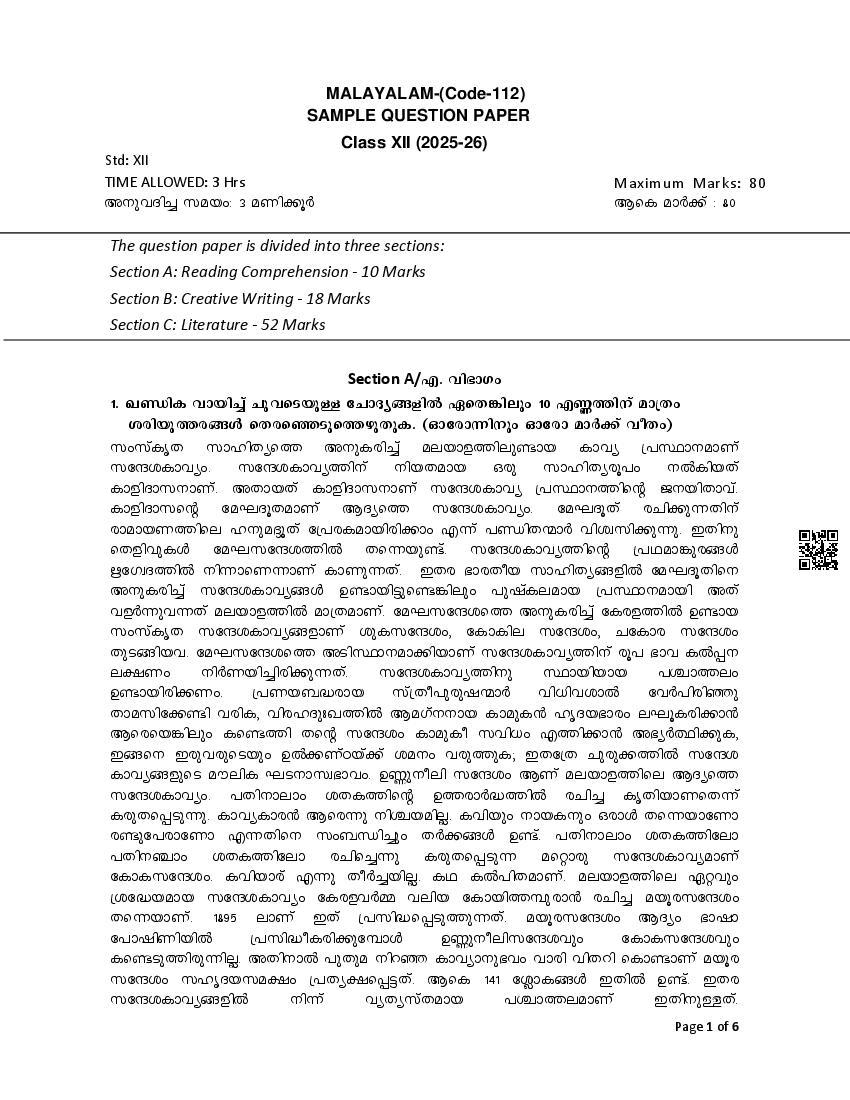 The complete CBSE class 12 Malayalam sample paper 2026 is as follows. However the download link for cbse sample paper Malayalam class 12 marking scheme is given above.