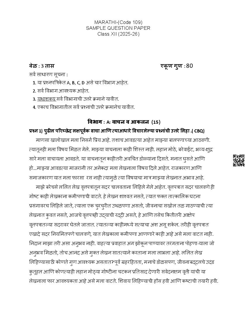 The complete CBSE class 12 Marathi sample paper 2026 is as follows. However the download link for cbse sample paper Marathi class 12 marking scheme is given above.