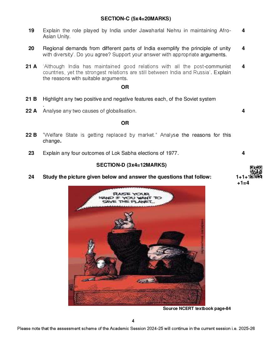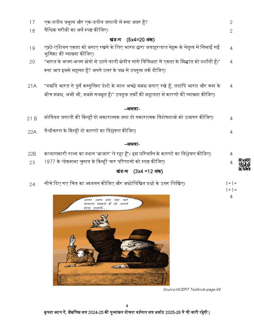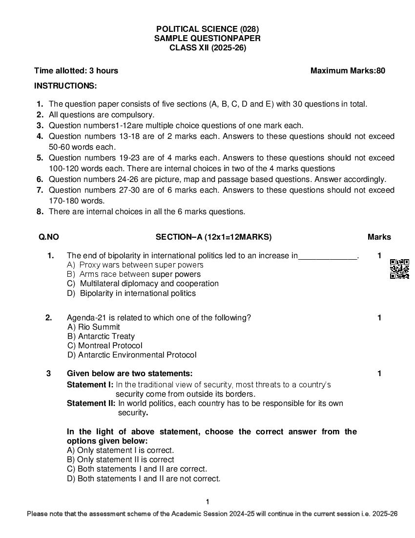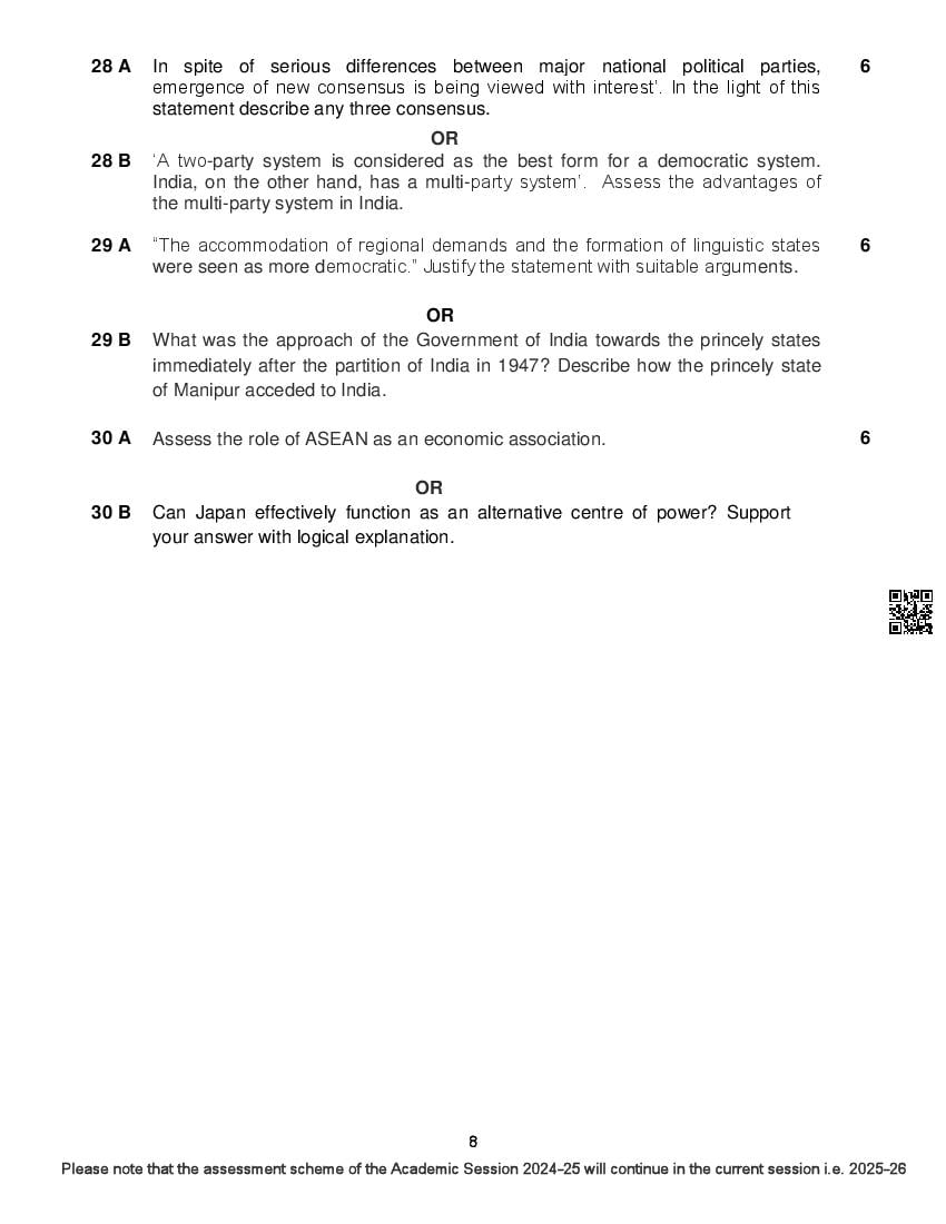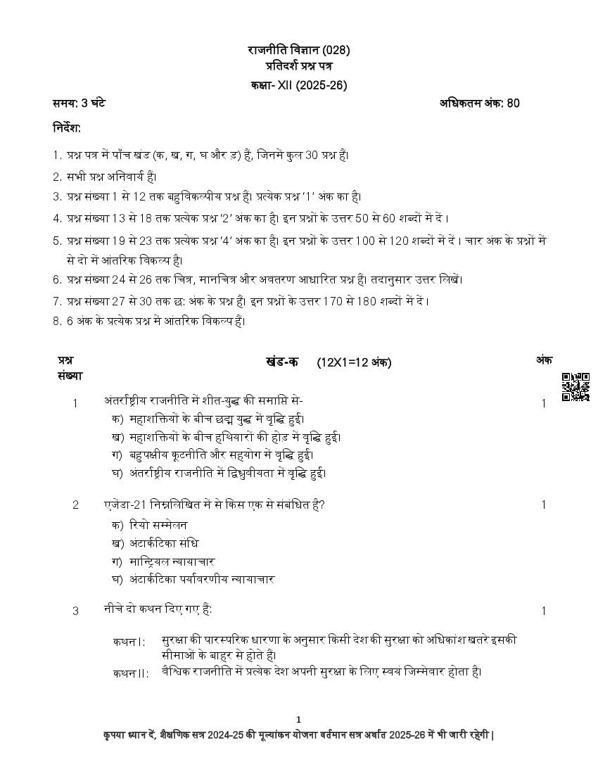 The complete CBSE class 12 Political Science sample paper 2026 is as follows. However the download link for cbse sample paper Political Science class 12 marking scheme is given above.