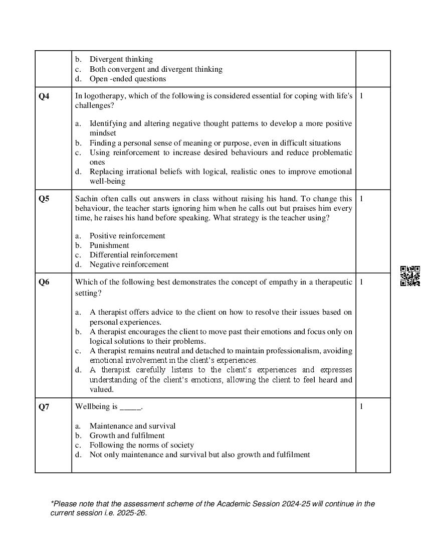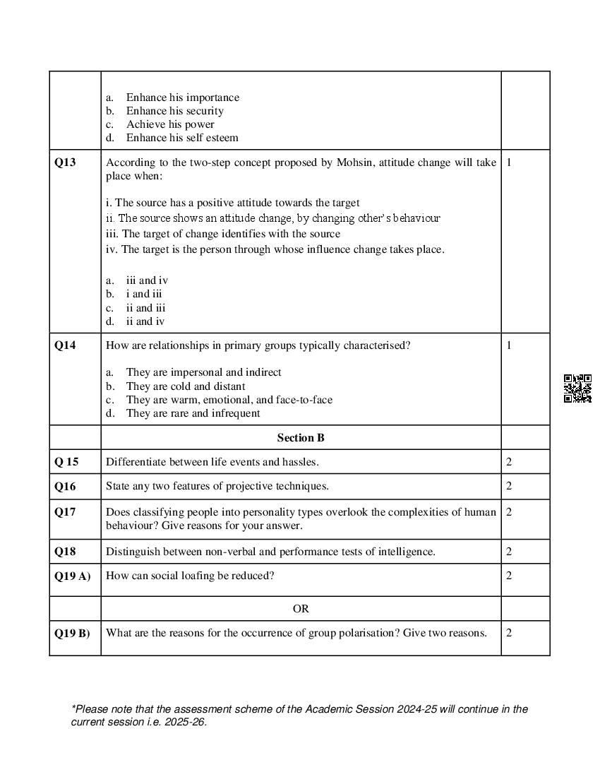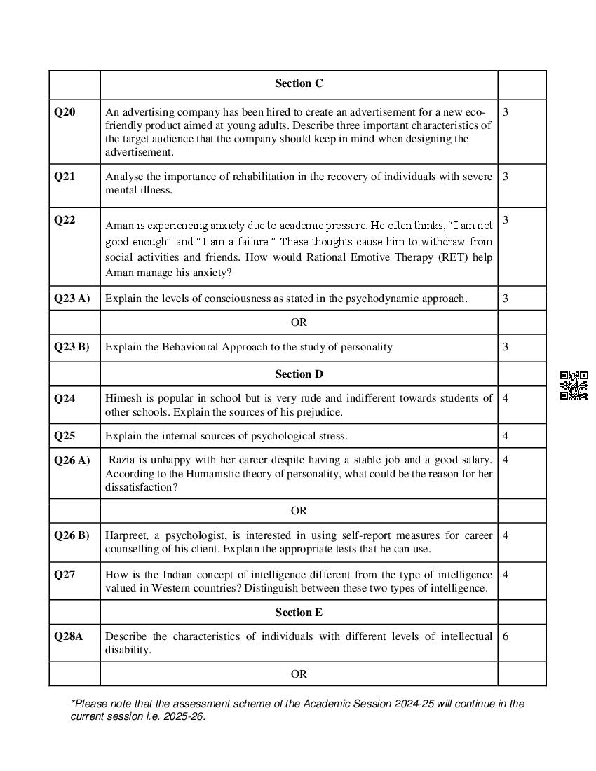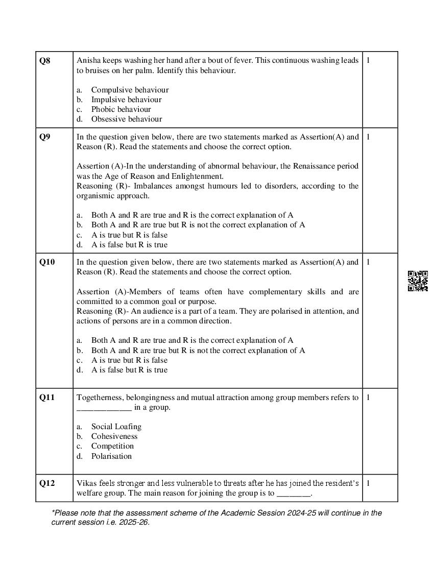 The complete CBSE class 12 Psychology sample paper 2026 is as follows. However the download link for cbse sample paper Psychology class 12 marking scheme is given above.