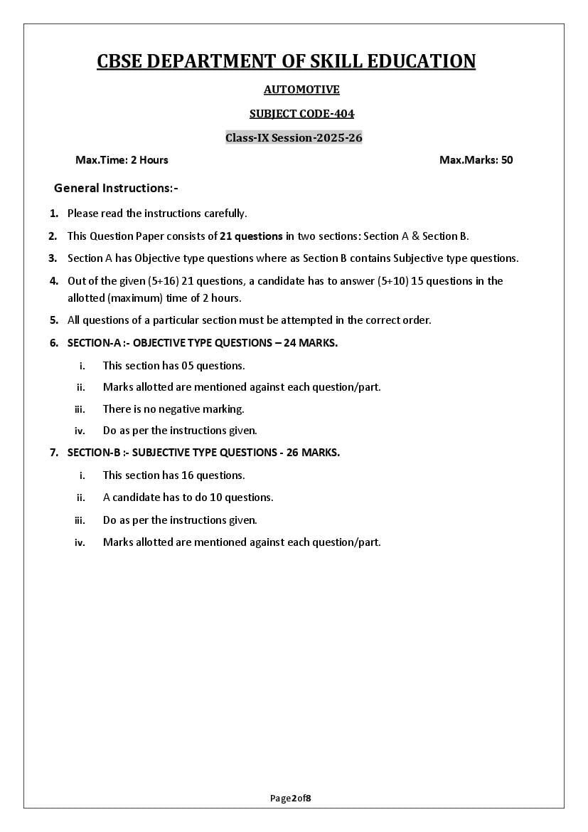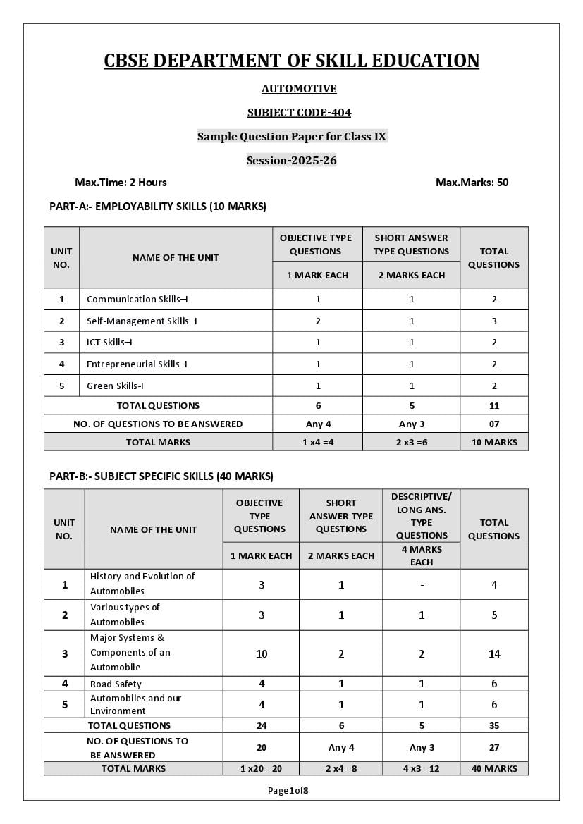 | Study Material Here | CBSE Sample Paper 2026 for Class 9 Automotive |