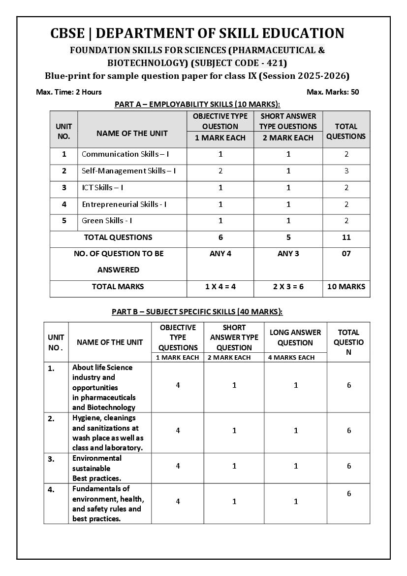 The complete CBSE class 9 Foundation Skills for Sciences sample paper 2026 is as follows. However the download link for cbse sample paper Foundation Skills for Sciences class 9 marking scheme is given above.