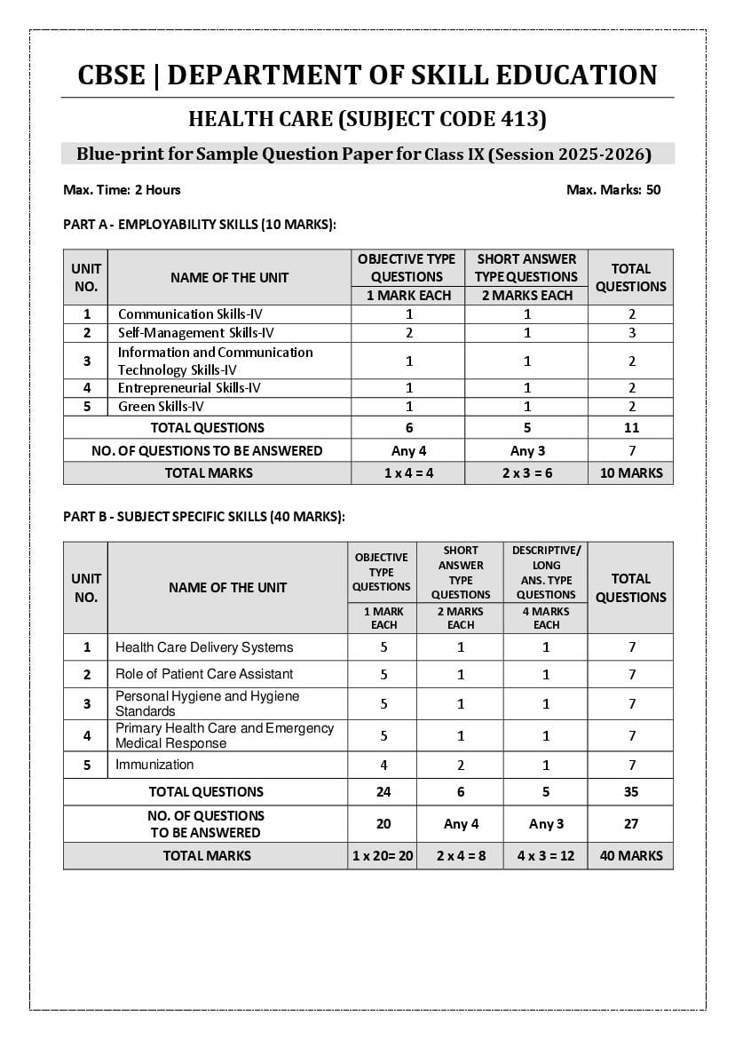 | Study Material Here | CBSE Sample Paper 2026 for Class 9 Health Care |