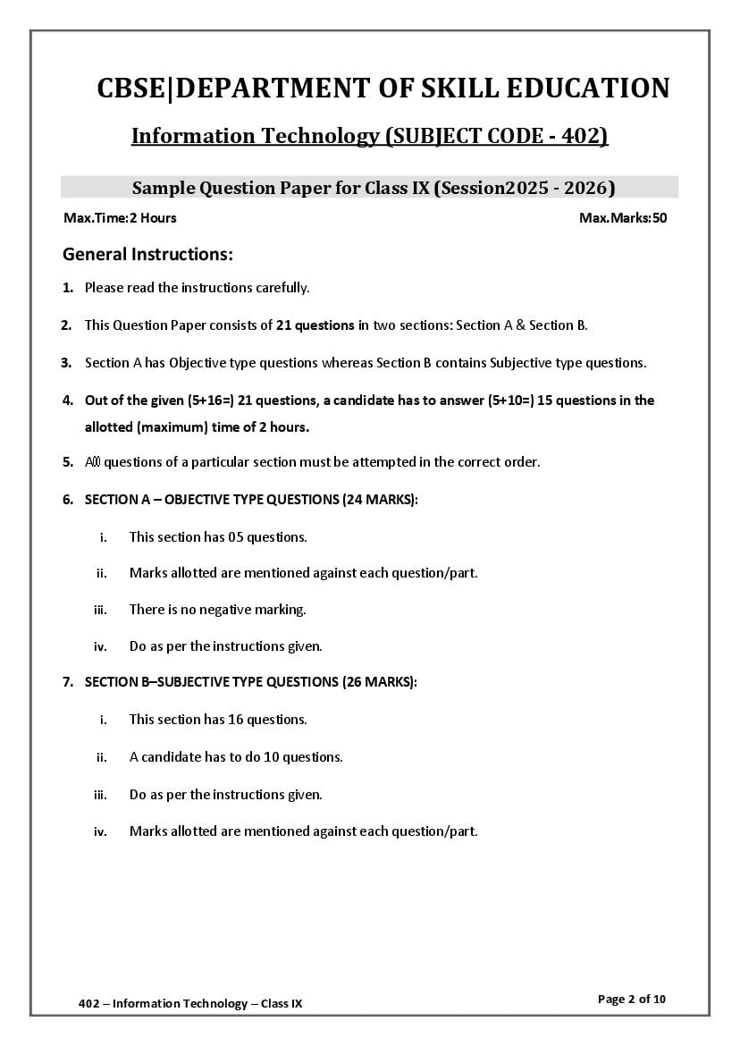 CBSE Class 9 Sample Paper 2026 for Information Technology View Download