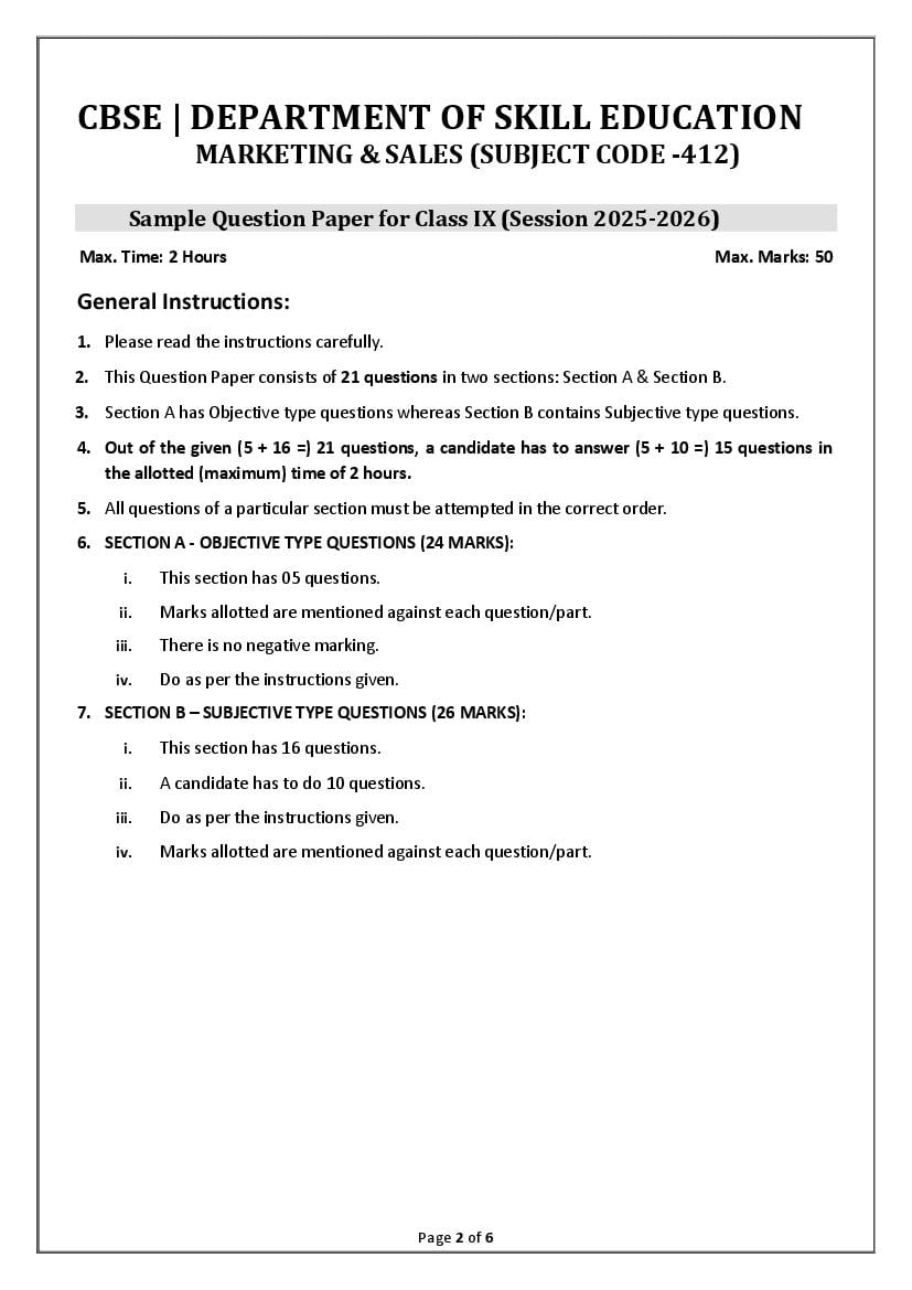 CBSE Class 9 Sample Paper 2026 for Marketing and Sales View Download