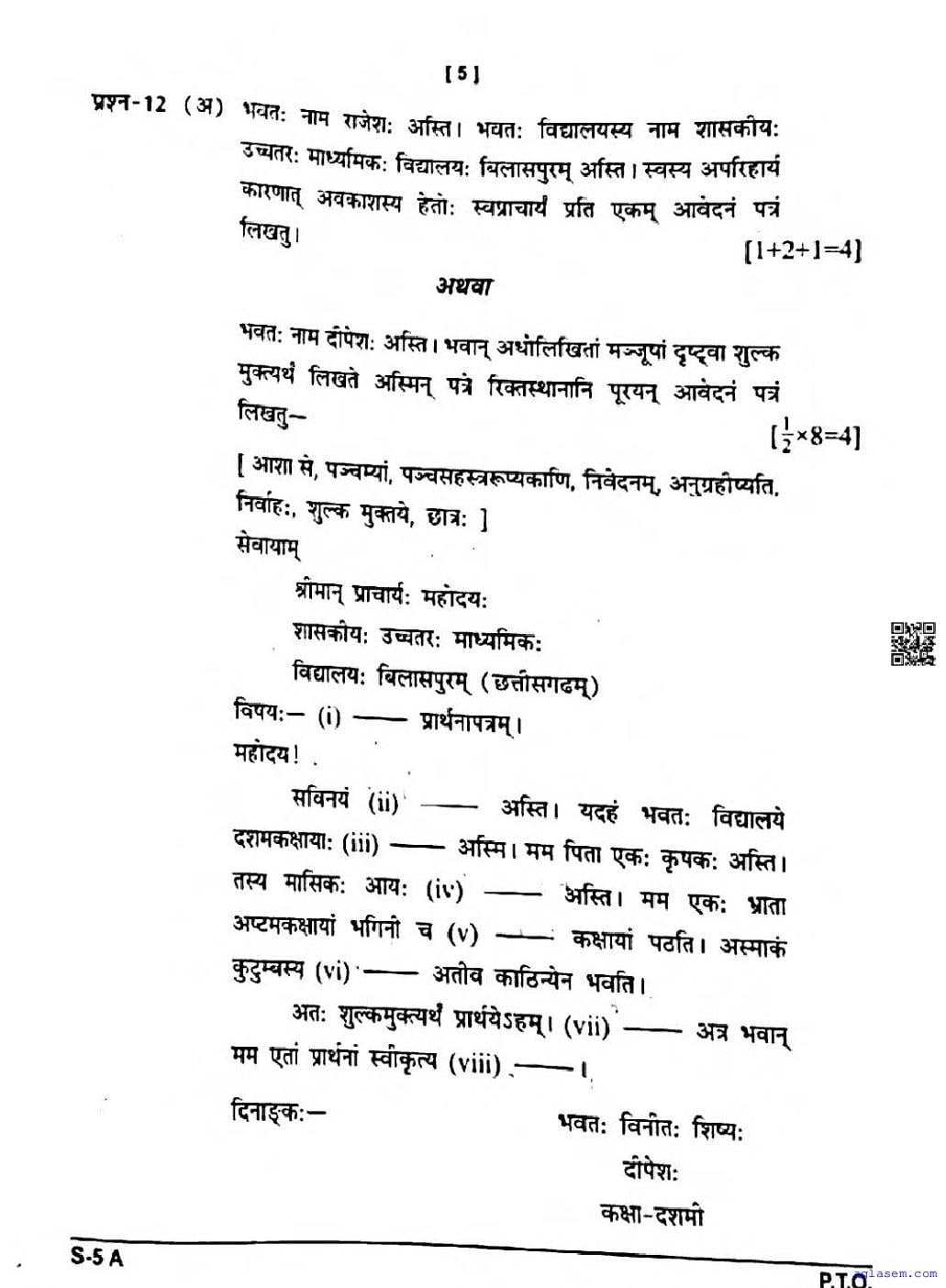 The CG Board Previous Year Question Paper for class 10 Sanskrit is as follows.
