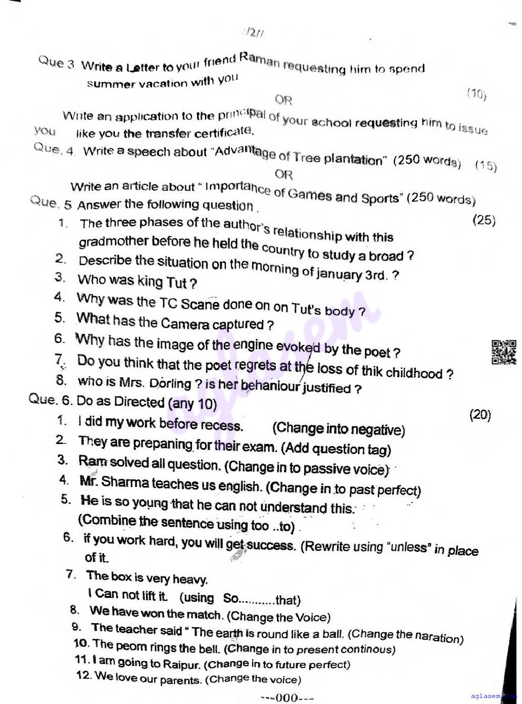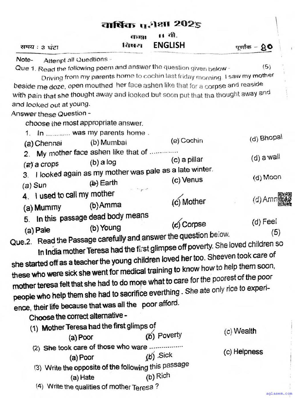 CG Board Class 11 English Question Paper 2026 is now available. You can download the CGBSE class 11th English Question Paper PDF from here on aglasem. This CG Board Class 11 Question Paper contains actual questions asked in English subject test in previous years with solutions. By solving this English paper, you wil increase your chances of getting full marks in Chhattisgarh Board exams of class 11th.