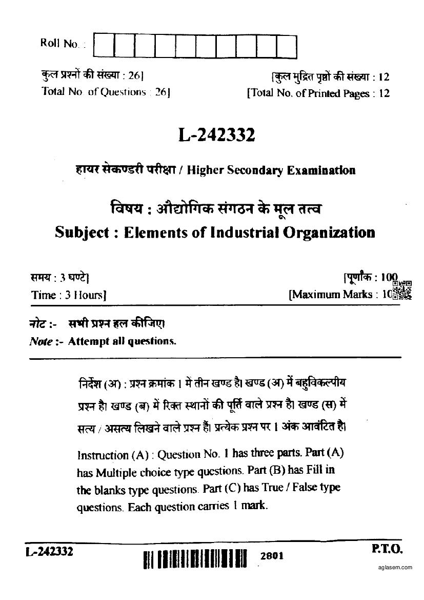 CG Board Class 12 Elements of Industrial Organization Question Paper 2024 is now available. You can download the CGBSE class 12th Elements of Industrial Organization Question Paper PDF from here on aglasem. This CG Board Class 12 Question Paper contains actual questions asked in Elements of Industrial Organization subject test in previous years with solutions. By solving this Elements of Industrial Organization paper, you wil increase your chances of getting full marks in Chhattisgarh Board exams of class 12th.