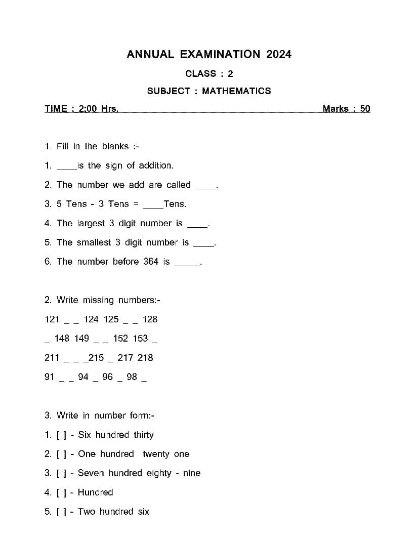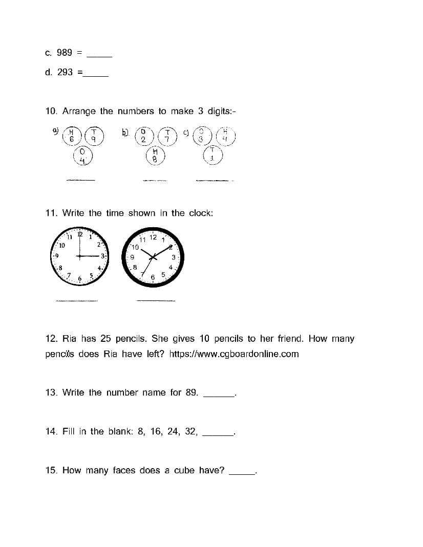 The CG Board Previous Year Question Paper for class 2 Maths is as follows.
