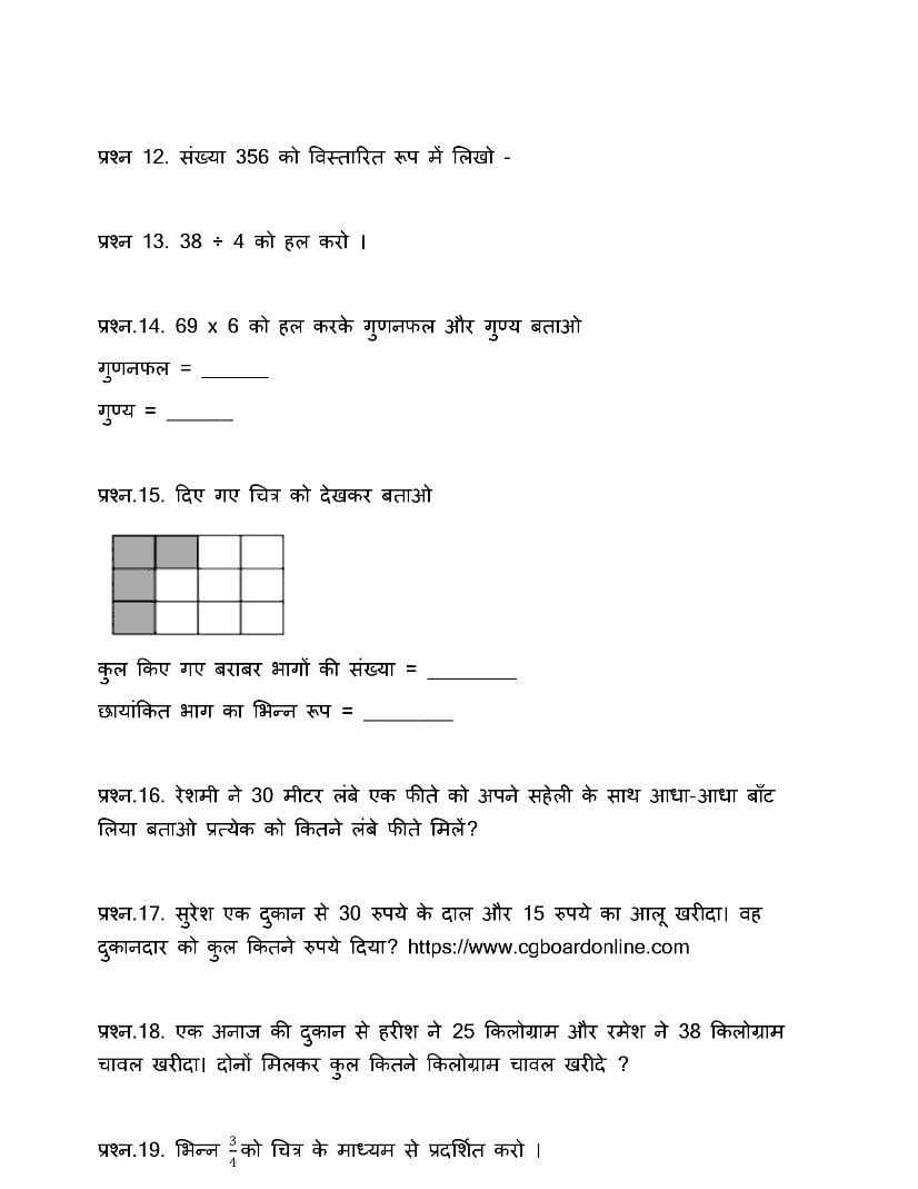 CG Board Class 3 Question Paper 2024 Maths View Download