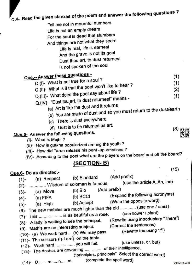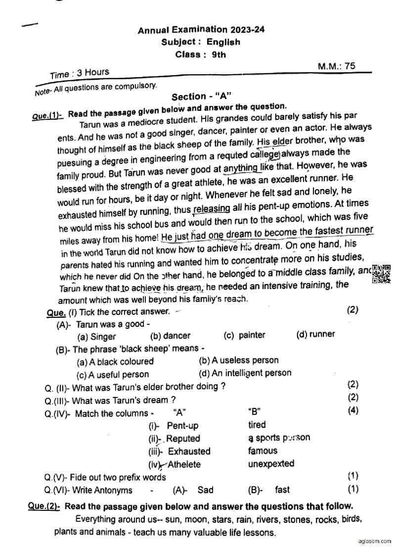 CG Board Class 9 English Question Paper 2024 is now available. You can download the CGBSE class 9th English Question Paper PDF from here on aglasem. This CG Board Class 9 Question Paper contains actual questions asked in English subject test in previous years with solutions. By solving this English paper, you wil increase your chances of getting full marks in Chhattisgarh Board exams of class 9th.
