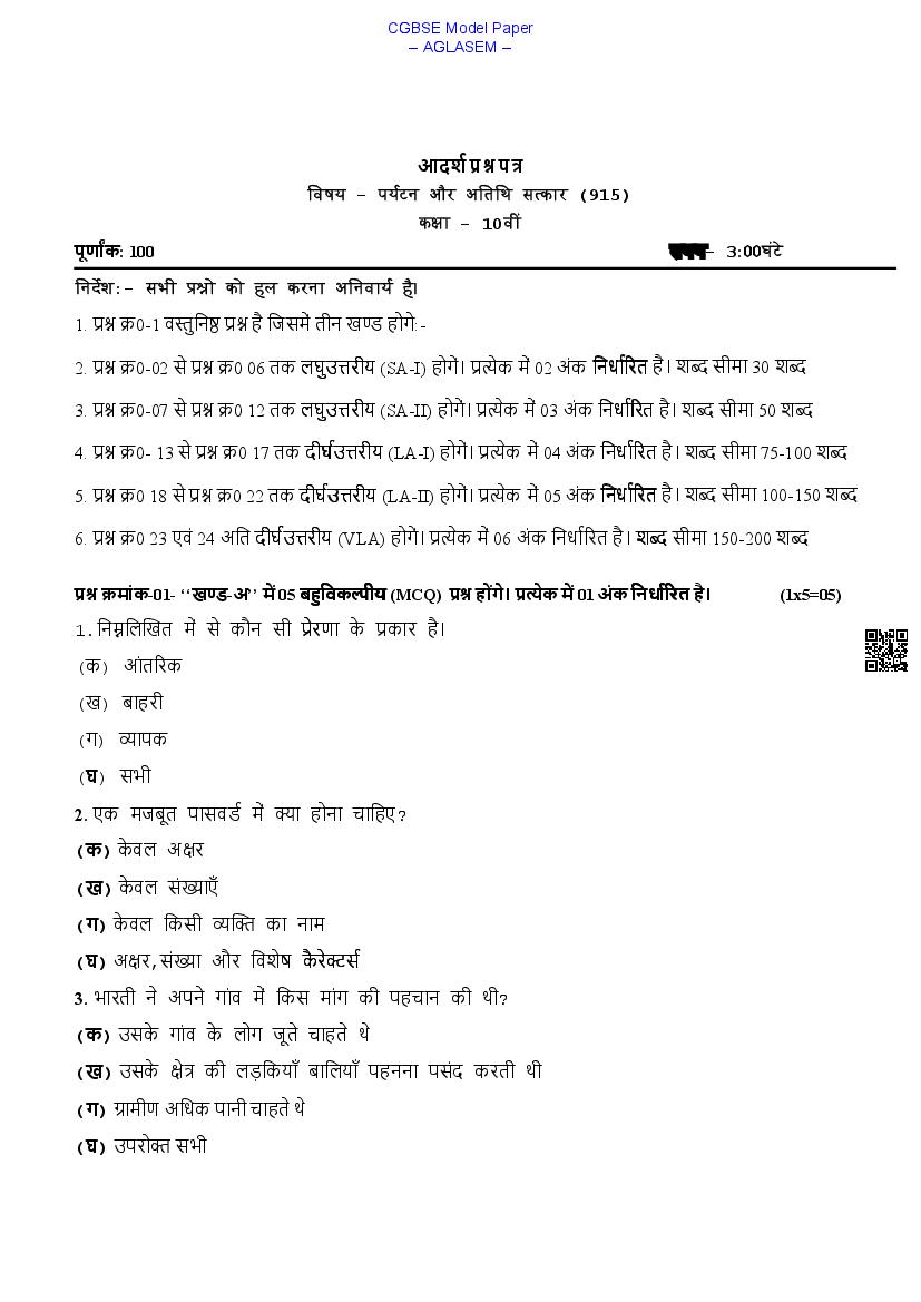 CG Board 10th Tourism and Hospitality Model Paper 2026 has been released by CGBSE. Therefore you can now download the CGBSE Class 10 Tourism and Hospitality Sample Paper PDF from aglasem.com to prepare for your exams. The CGBSE class 10 model paper for Tourism and Hospitality subject contains sample questions from the latest syllabus and pattern. Thus it is very useful to prepare for class 10 Tourism and Hospitality exam.