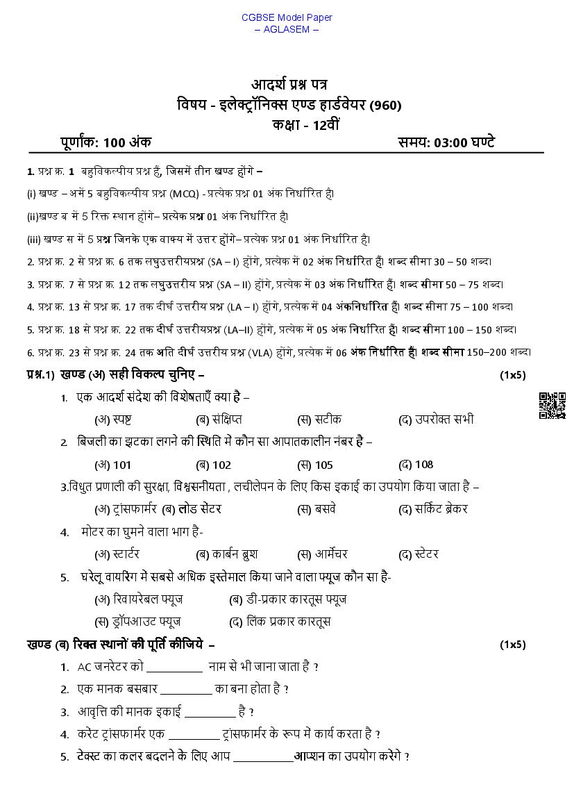 CG Board 12th Electronics and Hardware Model Paper 2026 has been released by CGBSE. Therefore you can now download the CGBSE Class 12 Electronics and Hardware Sample Paper PDF from aglasem.com to prepare for your exams. The CGBSE class 12 model paper for Electronics and Hardware subject contains sample questions from the latest syllabus and pattern. Thus it is very useful to prepare for class 12 Electronics and Hardware exam.