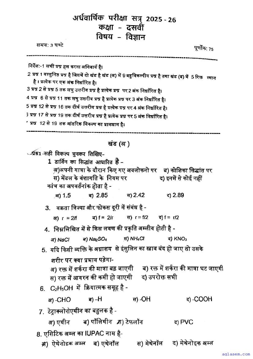 CG Board Class 10 Half Yearly Exam Science Question Paper 2026 is now available. You can download the CGBSE class 10th Half Yearly Exam Science Question Paper PDF from here on aglasem. This CG Board Class 10 Half Yearly Question Paper contains actual questions asked in Science subject Half Yearly test in previous years. By solving this Science paper, you wil increase your chances of getting full marks in Chhattisgarh State Board Half Yearly Exams of class 10th.