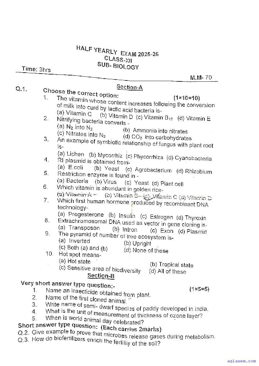 CG Board Class 12 Half Yearly Exam Biology Question Paper 2026 is now available. You can download the CGBSE class 12th Half Yearly Exam Biology Question Paper PDF from here on aglasem. This CG Board Class 12 Half Yearly Question Paper contains actual questions asked in Biology subject Half Yearly test in previous years. By solving this Biology paper, you wil increase your chances of getting full marks in Chhattisgarh State Board Half Yearly Exams of class 12th.