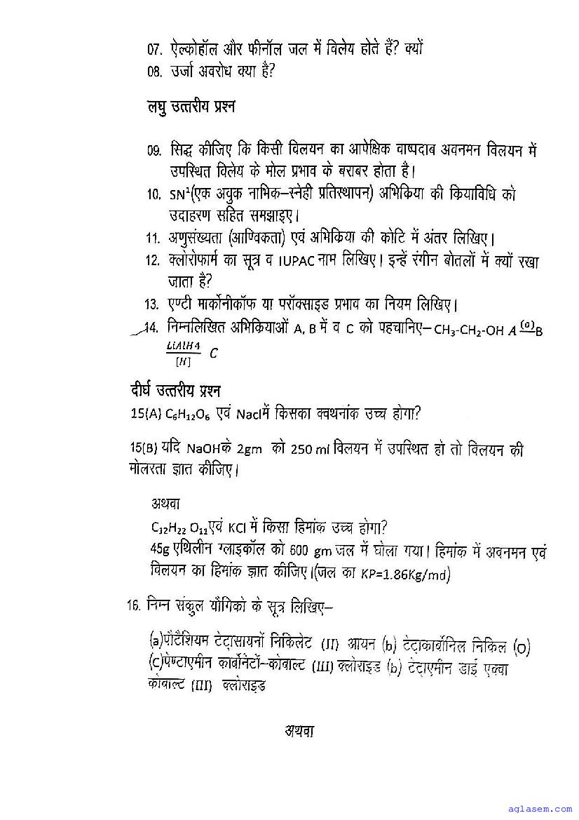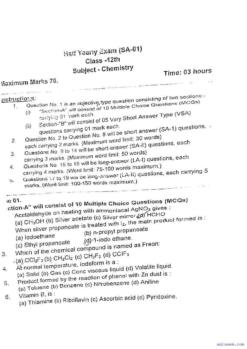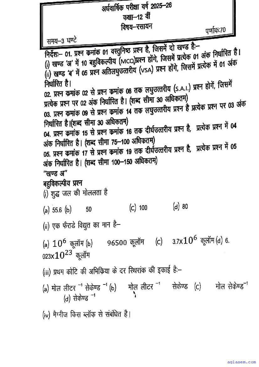CG Board Class 12 Half Yearly Exam Chemistry Question Paper 2026 is now available. You can download the CGBSE class 12th Half Yearly Exam Chemistry Question Paper PDF from here on aglasem. This CG Board Class 12 Half Yearly Question Paper contains actual questions asked in Chemistry subject Half Yearly test in previous years. By solving this Chemistry paper, you wil increase your chances of getting full marks in Chhattisgarh State Board Half Yearly Exams of class 12th.