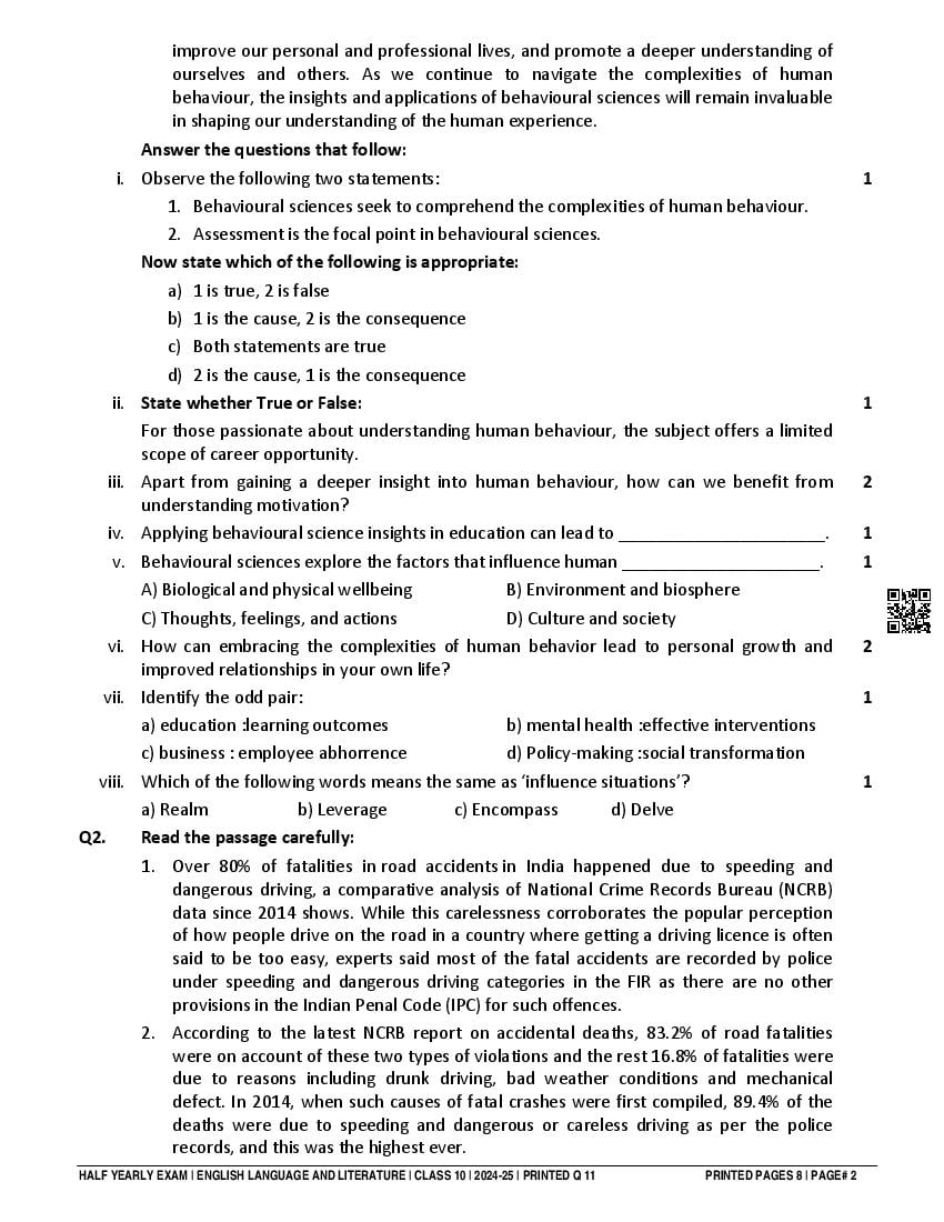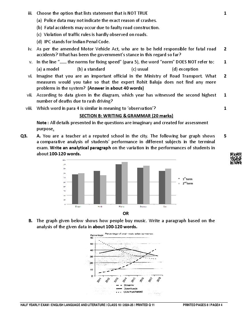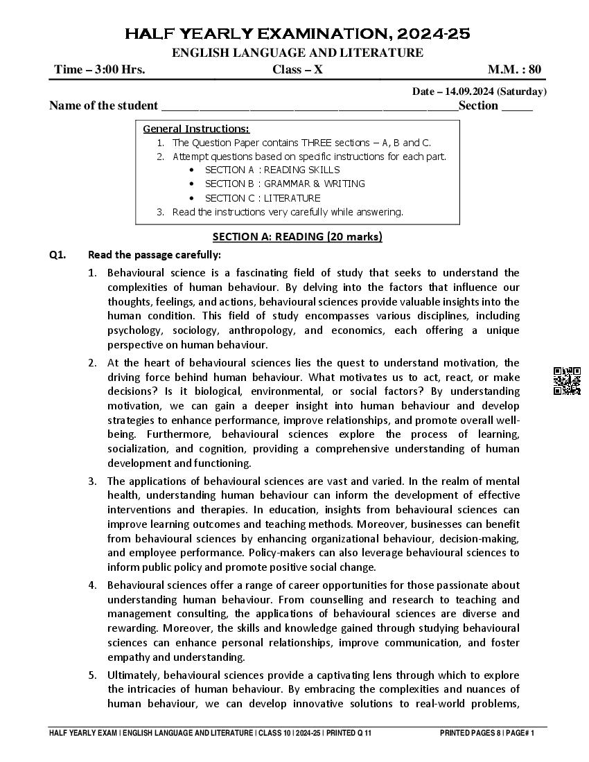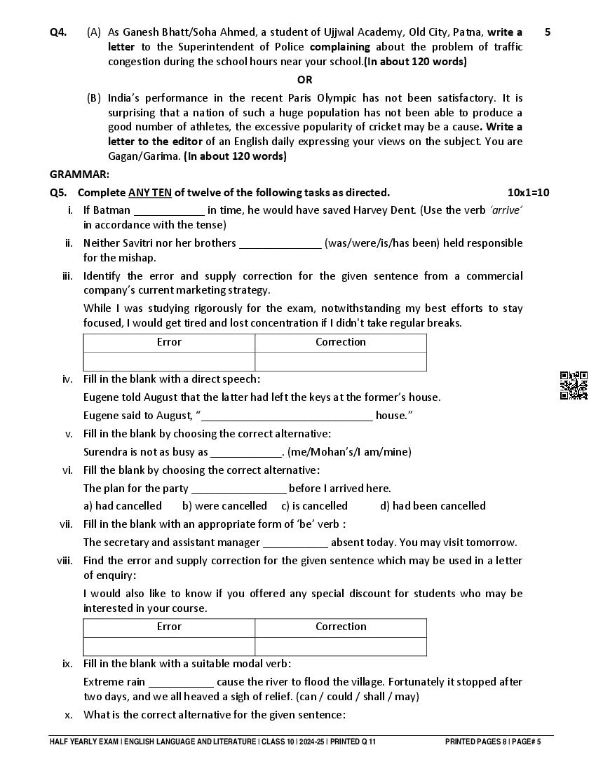 Class 10 Question Paper 2024-25 English (Half Yearly) View Download