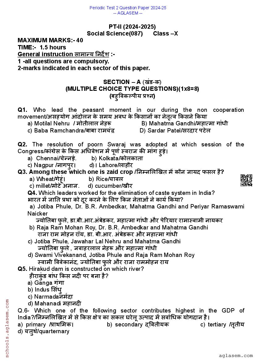 The Class 10 PT 2 Question Paper Social Science 2024-25 PDF is is made available here by aglasem for your exam preparation. You can download the Class 10 PT II Social Science Question Paper PDF from here on aglasem.com to prepare for this crucial exam. It is important to solve this Social Science question paper, along with other Class 10 PT Question Paper if you are a student in the 10th grade, as it helps you understand the pattern and type of questions you will face in your upcoming periodic test exams. The Social Science Periodic Test 2 Question Paper is designed to test the student’s understanding of various Social Science concepts taught in the first term. Here, you will know everything about the Class 10 PT 2 Social Science Question Paper, including tips, sample questions, and resources for effective preparation.