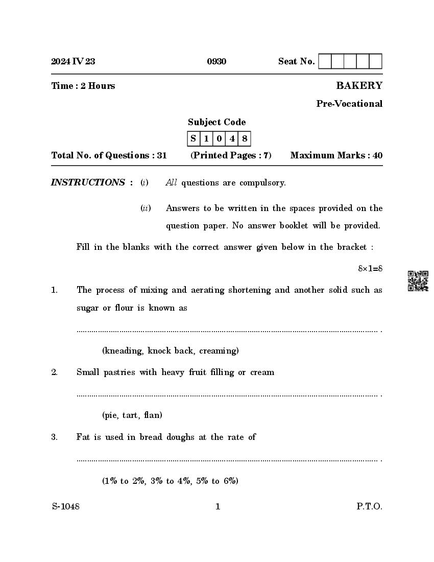 Goa Board Class 10 Question Paper 2024 for Bakery PDF Download – Download PDF