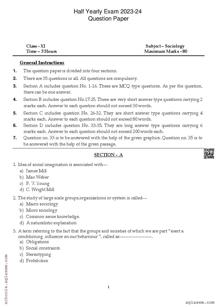 Class 11 Question Paper 2023-24 Sociology (Half Yearly) View Download