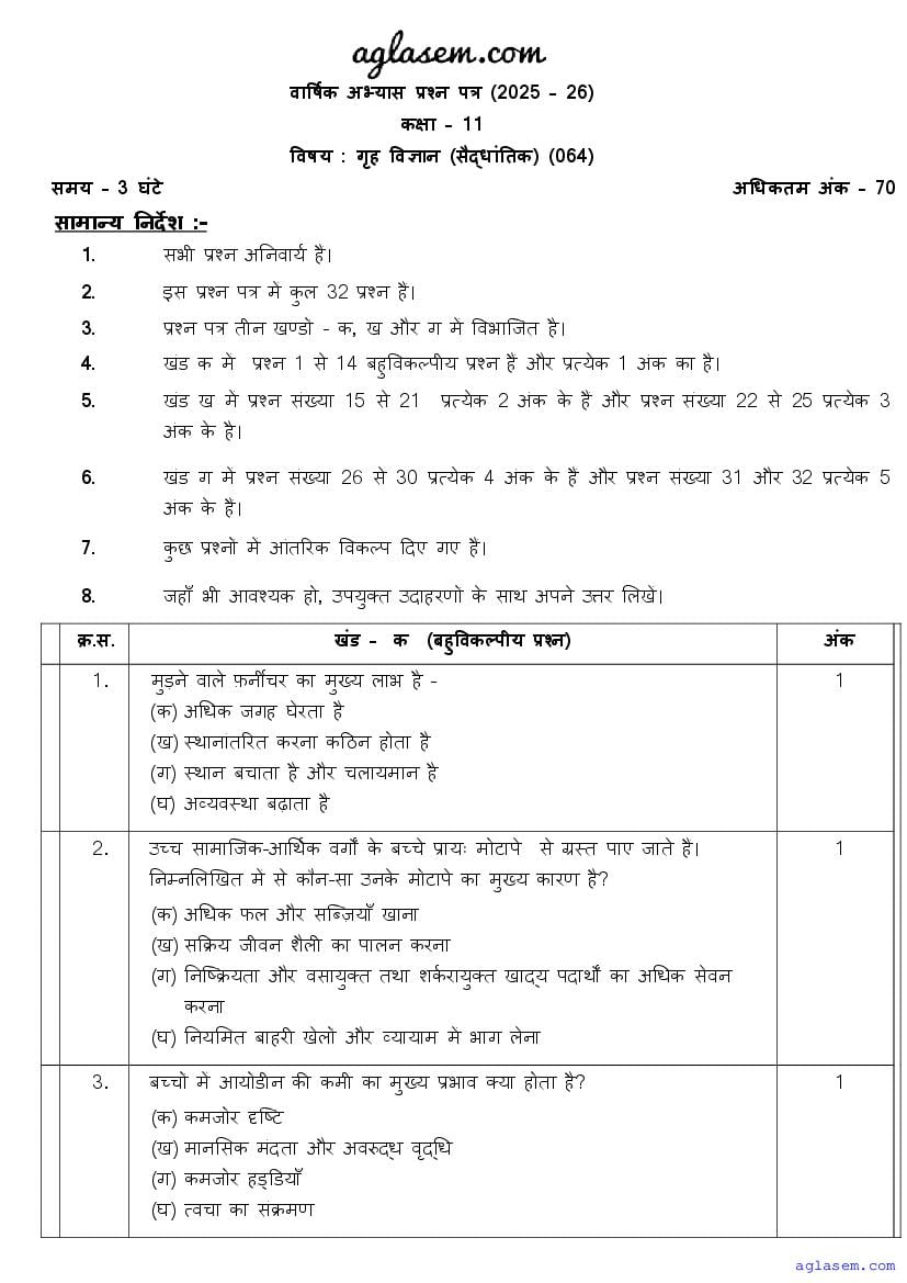 Class 11 Home Science Sample Paper 2026 is now available! If you are currently in class 11 and preparing for your annual or final exams, don’t miss the opportunity to download the Home Science sample paper PDF from aglasem.com. This comprehensive sample paper is designed specifically for class 11 and includes a variety of questions covering the entire Home Science syllabus for class 11th. By practicing these questions, you’ll be well-equipped to achieve excellent marks in your class 11 yearly exams!