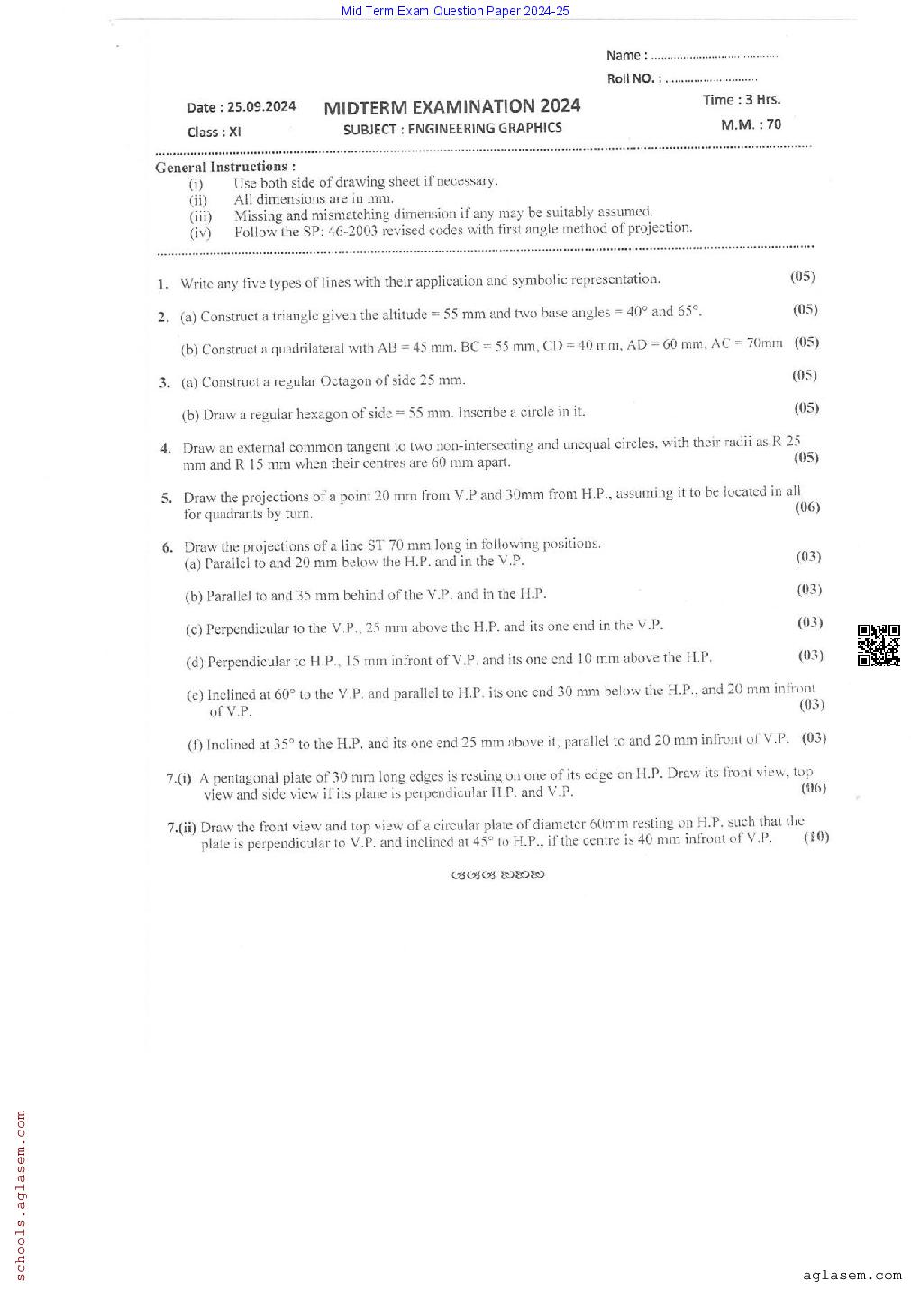 Class 11 Engineering Graphics Mid Term Question Paper 2024-25 – Click Here to Download Question Paper PDF