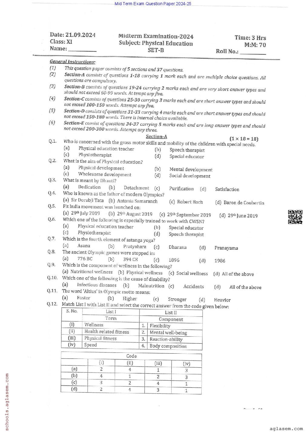 Download Class 11 Physical Education Mid Term Question Paper 2025 PDF