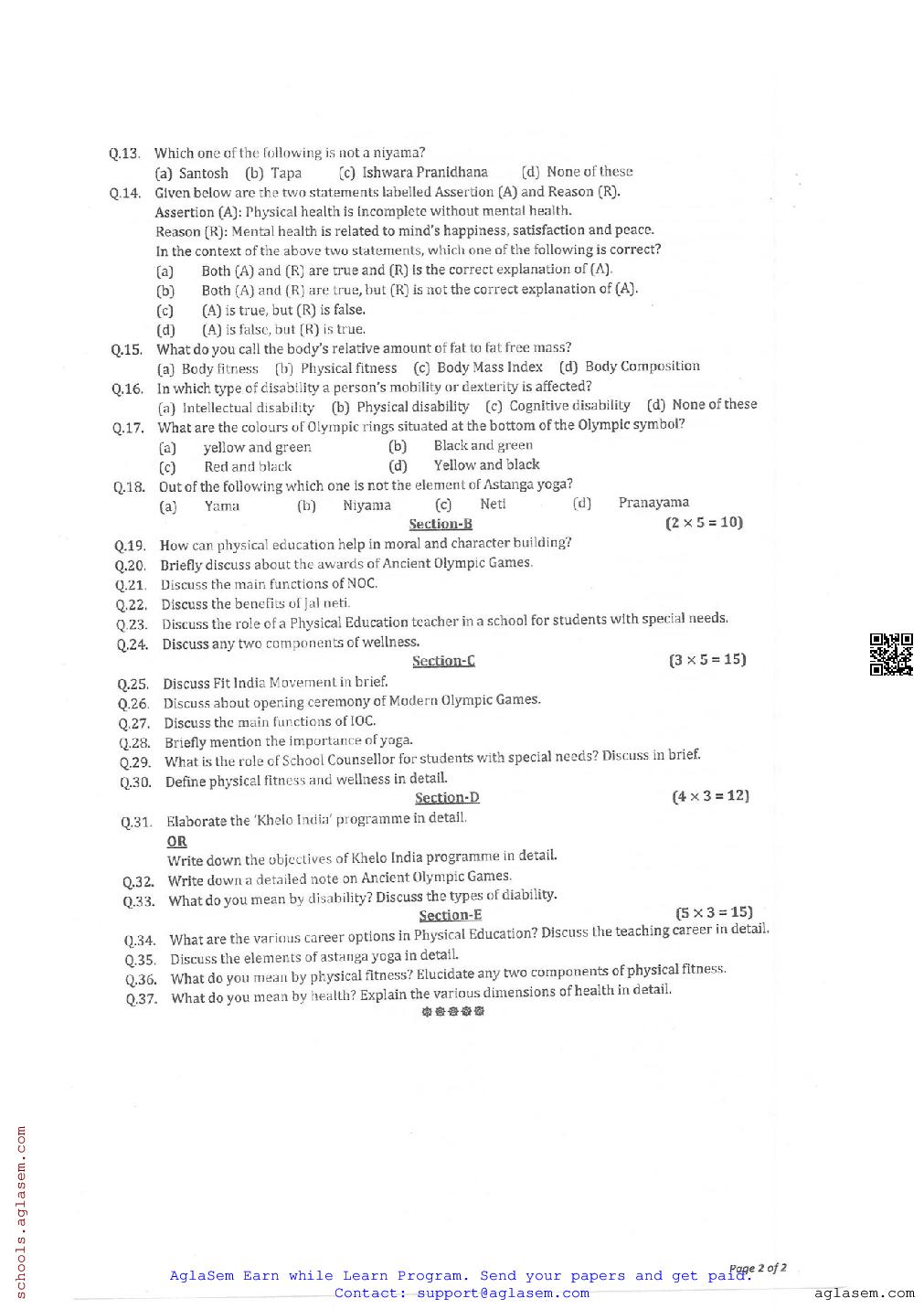 Class 11 Question Paper 2024-25 Physical Education (Mid Term) View Download