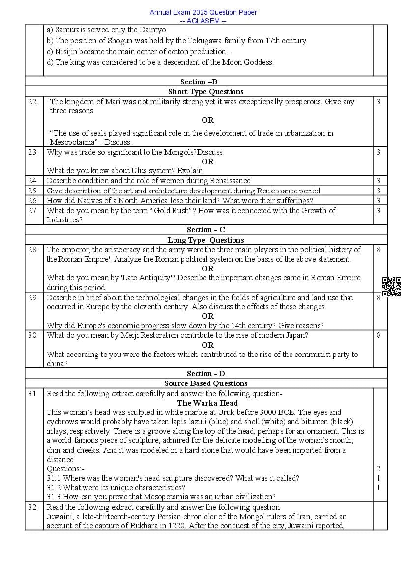 Class 11 History Question Paper 2025 contains important practice questions and solutions based on the History exam for 11th standard annual assessments. At aglasem.com, you can quickly download the 11th Annual Exam History Question Paper PDF and previous year papers for free. The class 11 History question paper is an essential study resource for exam preparation, helping you understand the exam pattern and frequently asked questions. If you are a 11th student, solving these History previous year question papers will strengthen your preparation, improve time management, and boost confidence for the final exams.