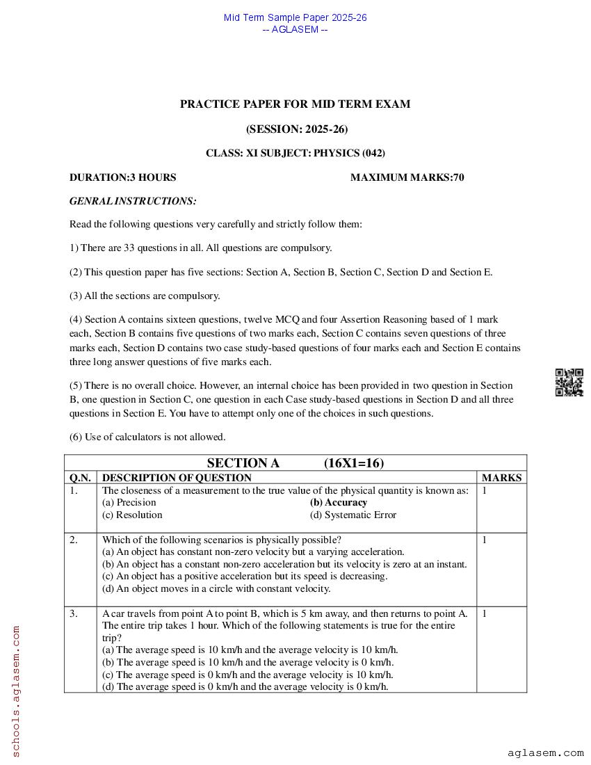 Get the Class 11 Physics Mid Term Sample Paper 2025 for your school mid term examination. These Class 11 Physics Mid Term Sample Paper 2025 for are developed by experts based on NCERT syllabus. You can now download the Class 11 Physics Mid Term Model Question Paper PDF here at aglasem. This class 11 mid term sample paper for Physics contains specimen questions from the latest class 11 Physics syllabus and gives you a good idea of what to expect in Physics paper in periodic tests, unit tests or term 1 examination. Therefore, by solving the Physics sample paper, you can aim for better marks in class 11 periodic test.
