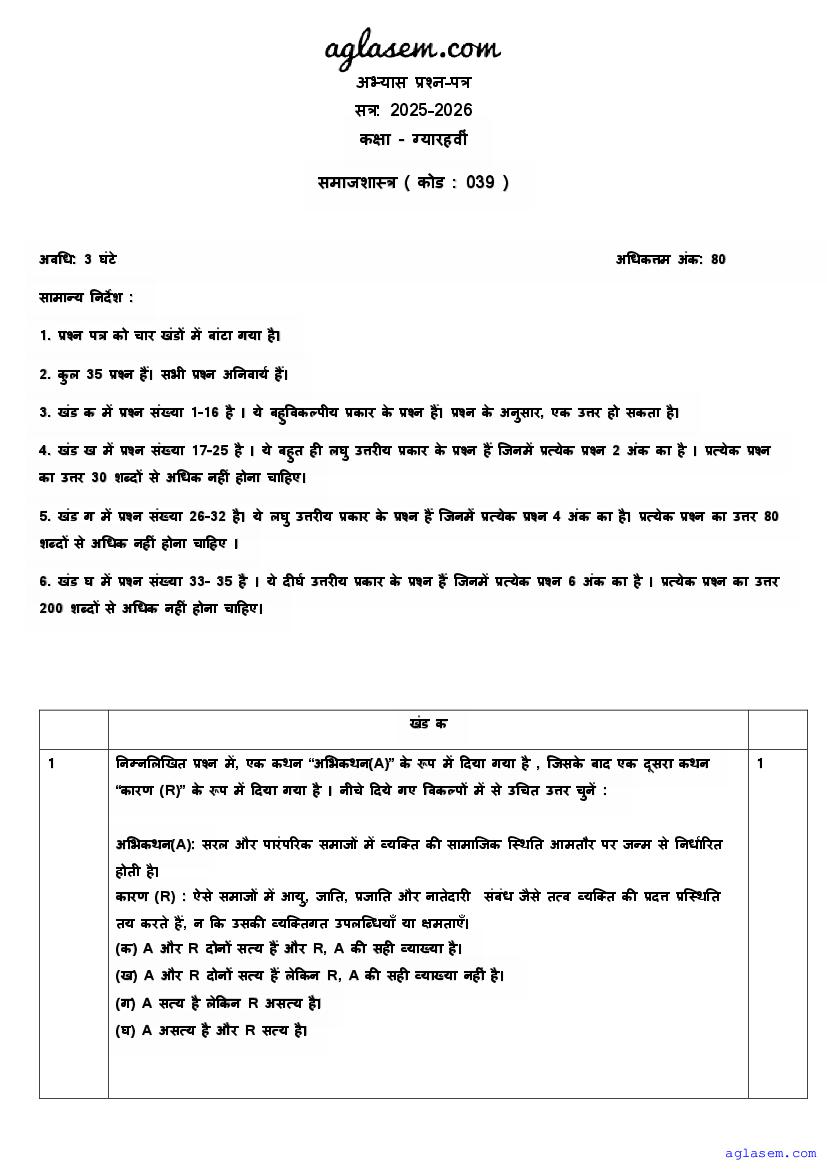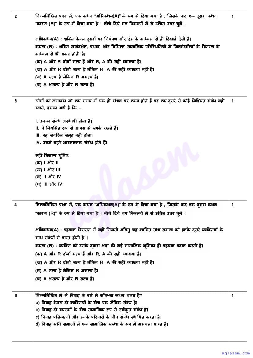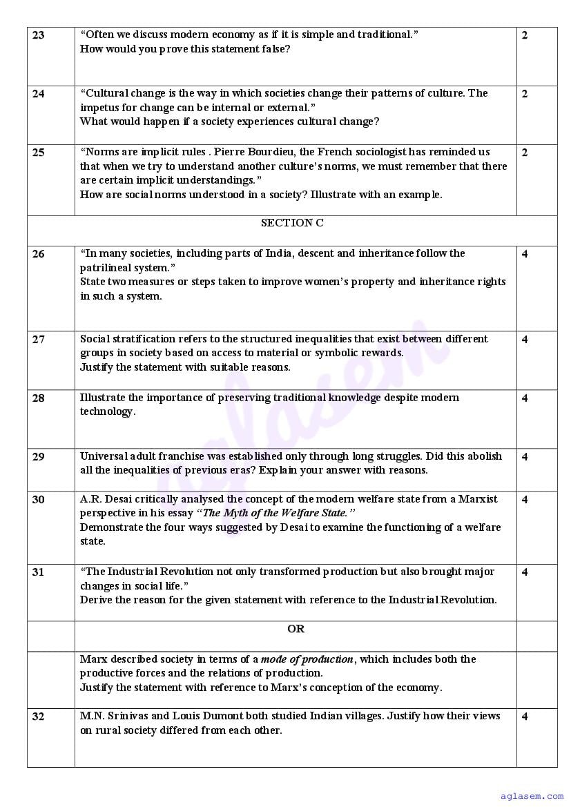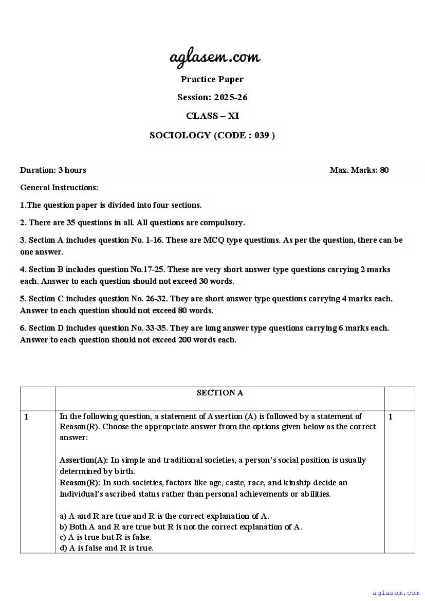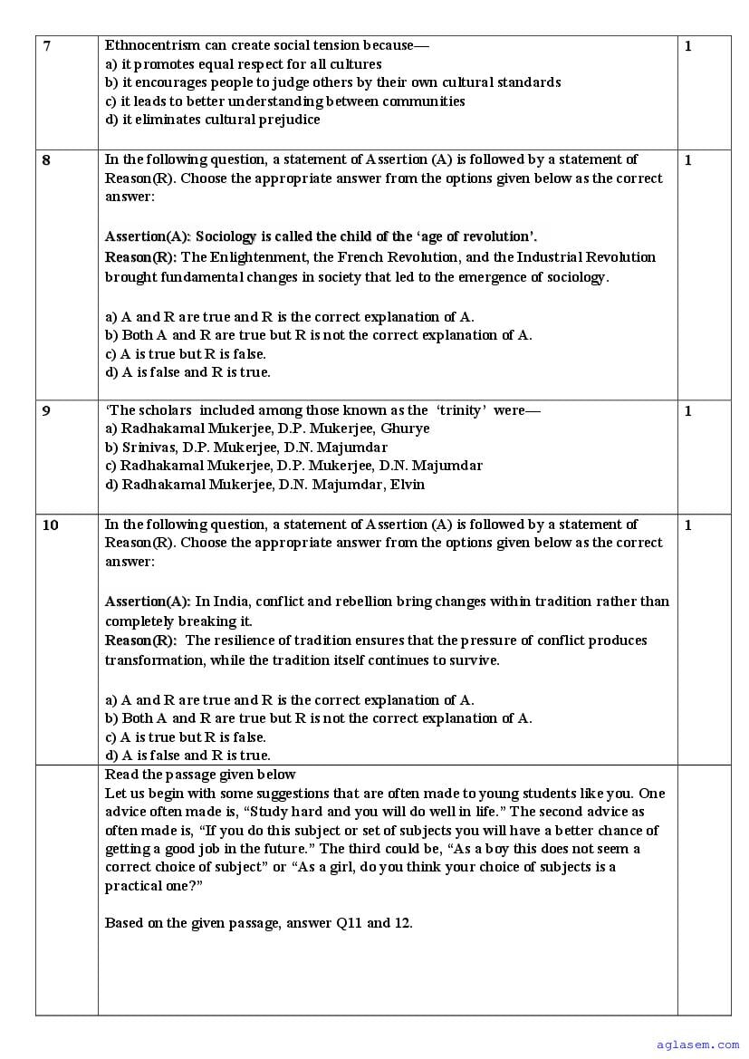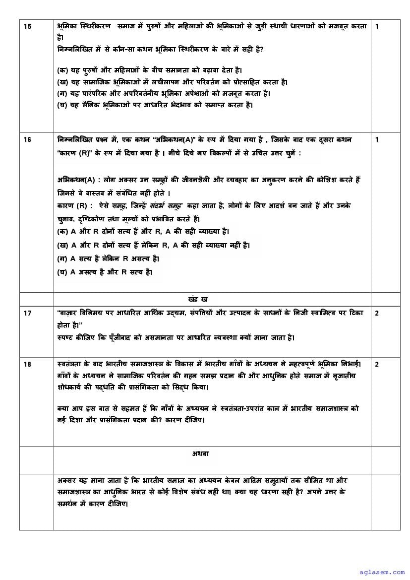 | AglaSem Paper | Class 11 Sample Paper of Sociology |