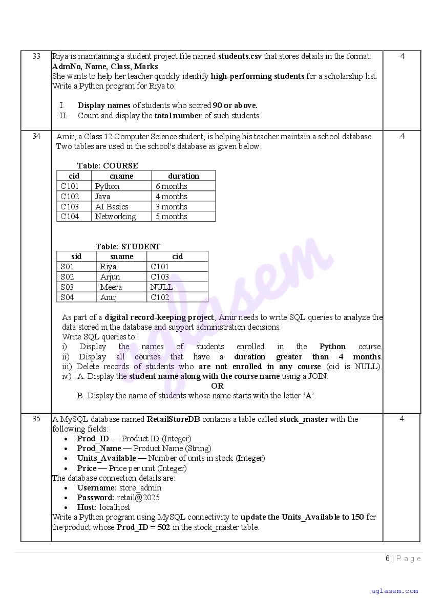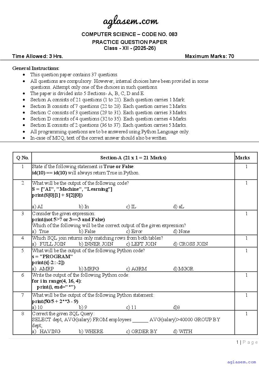 Class 12 Computer Science Sample Paper 2026 is now available! If you are currently in class 12 and preparing for your annual or final exams, don’t miss the opportunity to download the Computer Science sample paper PDF from aglasem.com. This comprehensive sample paper is designed specifically for class 12 and includes a variety of questions covering the entire Computer Science syllabus for class 12th. By practicing these questions, you’ll be well-equipped to achieve excellent marks in your class 12 yearly exams!