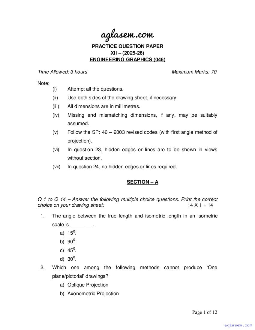 Class 12 Engineering Graphics Sample Paper 2026 is now available! If you are currently in class 12 and preparing for your annual or final exams, don’t miss the opportunity to download the Engineering Graphics sample paper PDF from aglasem.com. This comprehensive sample paper is designed specifically for class 12 and includes a variety of questions covering the entire Engineering Graphics syllabus for class 12th. By practicing these questions, you’ll be well-equipped to achieve excellent marks in your class 12 yearly exams!