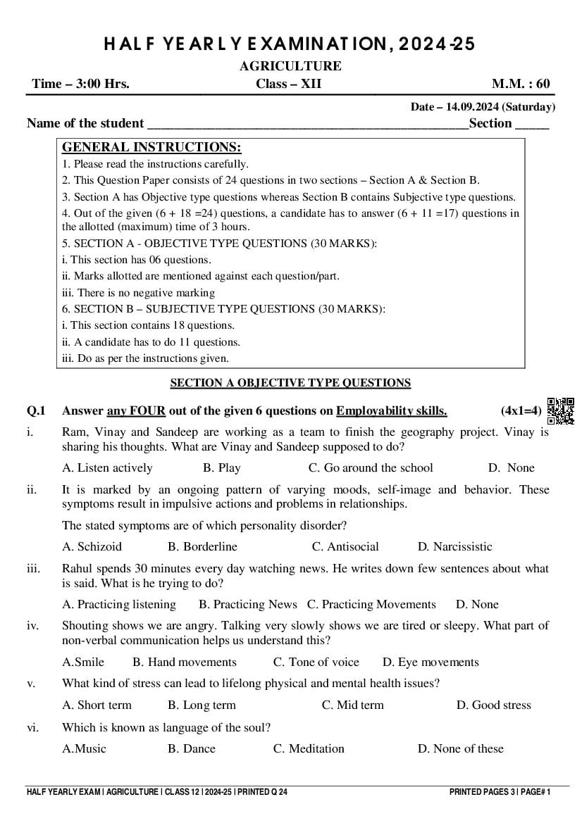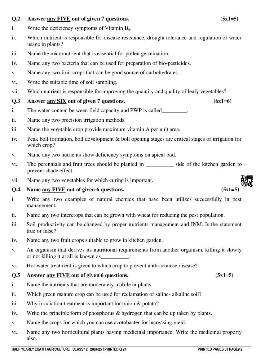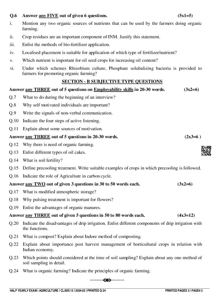 Class 12 Question Paper 2024-25 Agriculture (Half Yearly) View Download