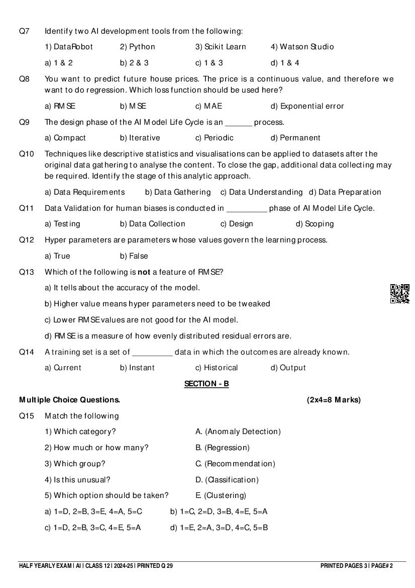 Class 12 Question Paper 2024-25 Artificial Intelligence (Half Yearly) View Download