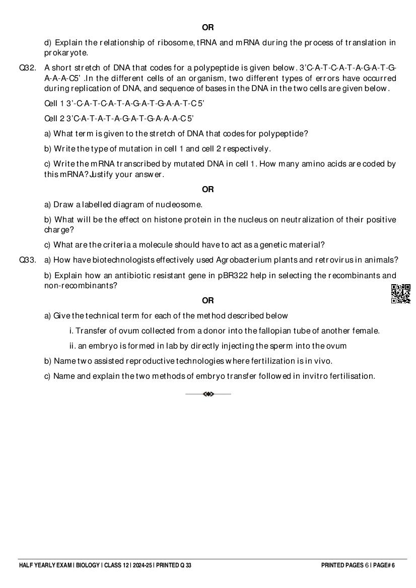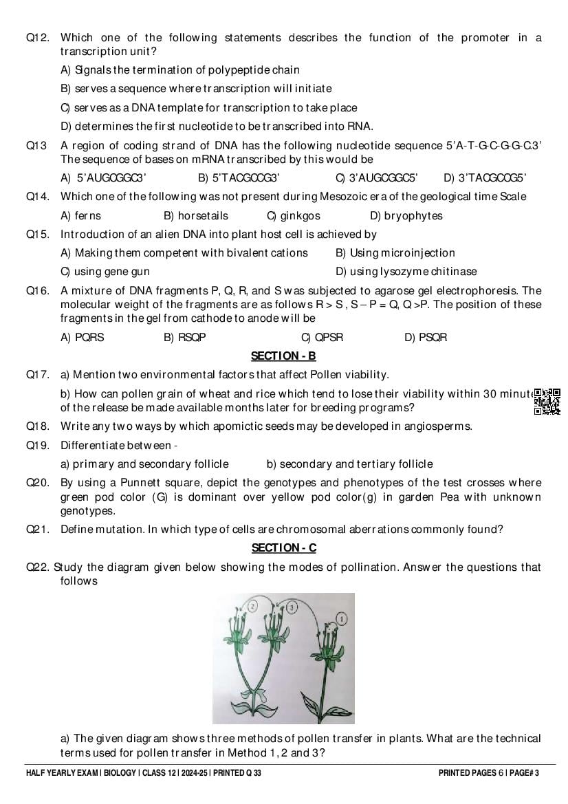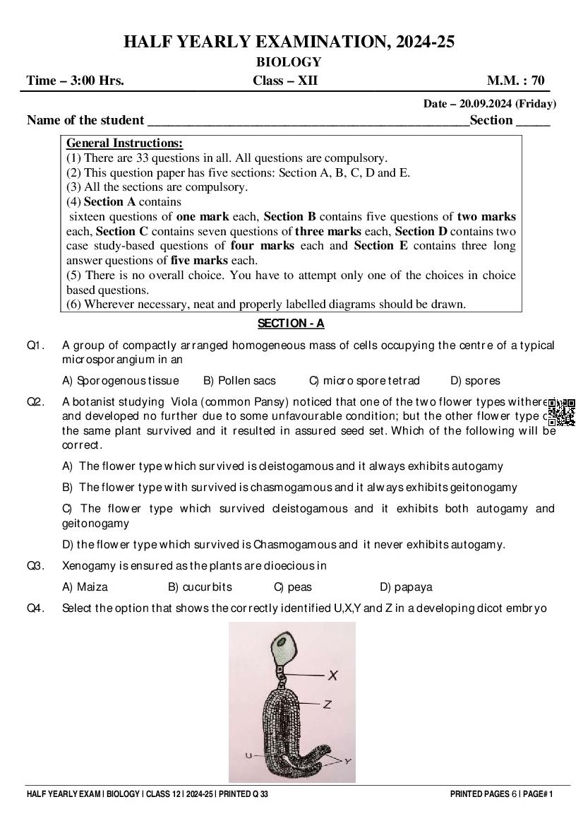 Class 12 Biology Half Yearly Question Paper 2025