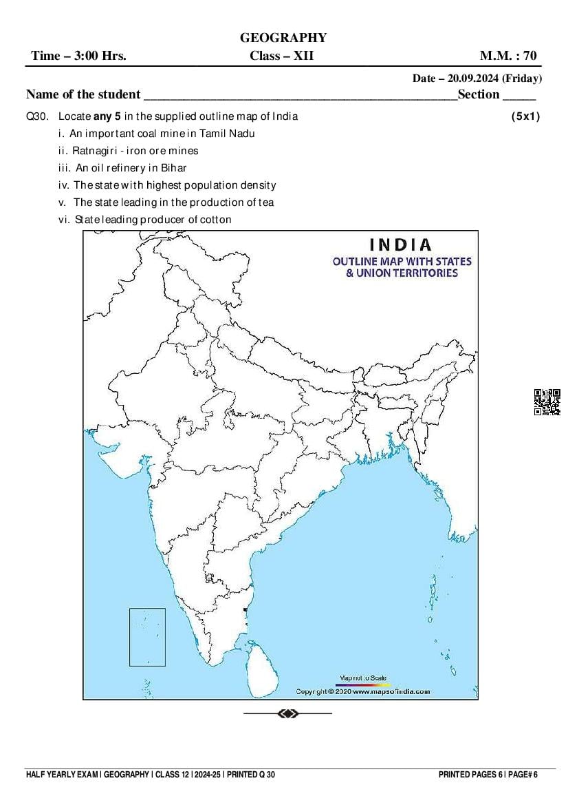 Class 12 Geography Half Yearly Question Paper 2025