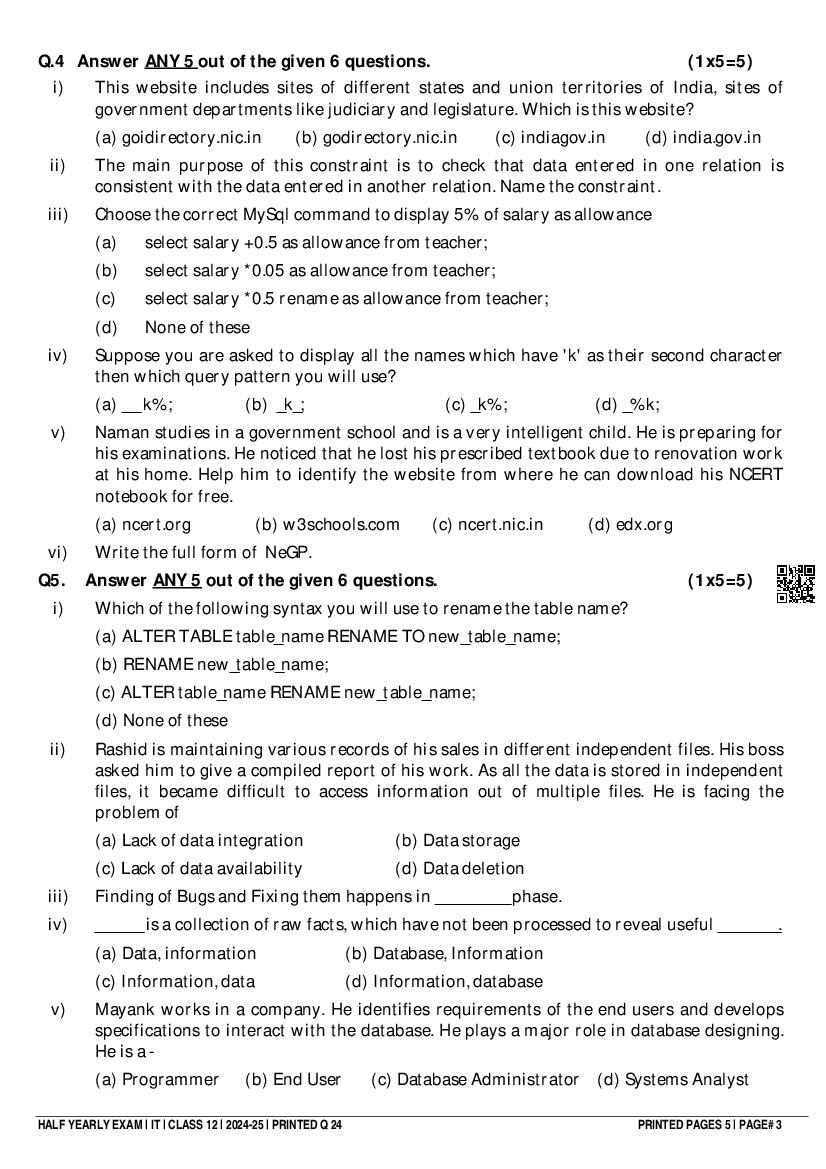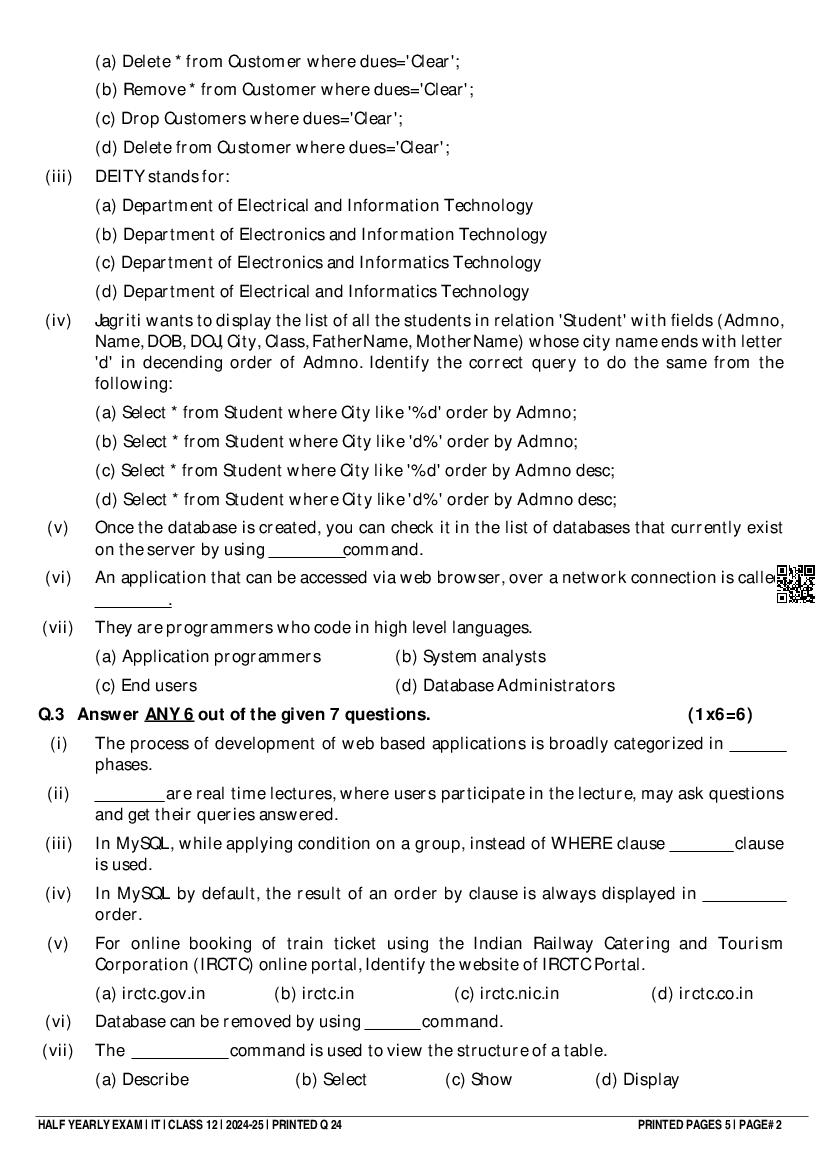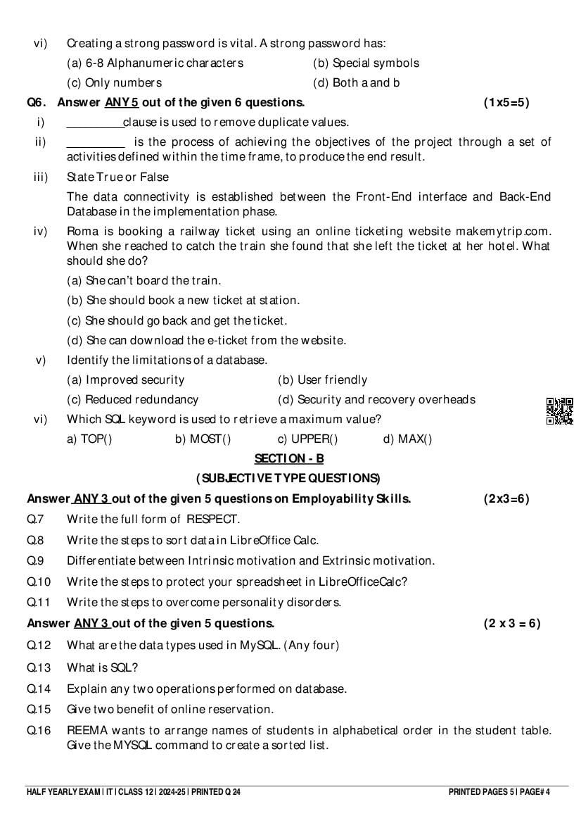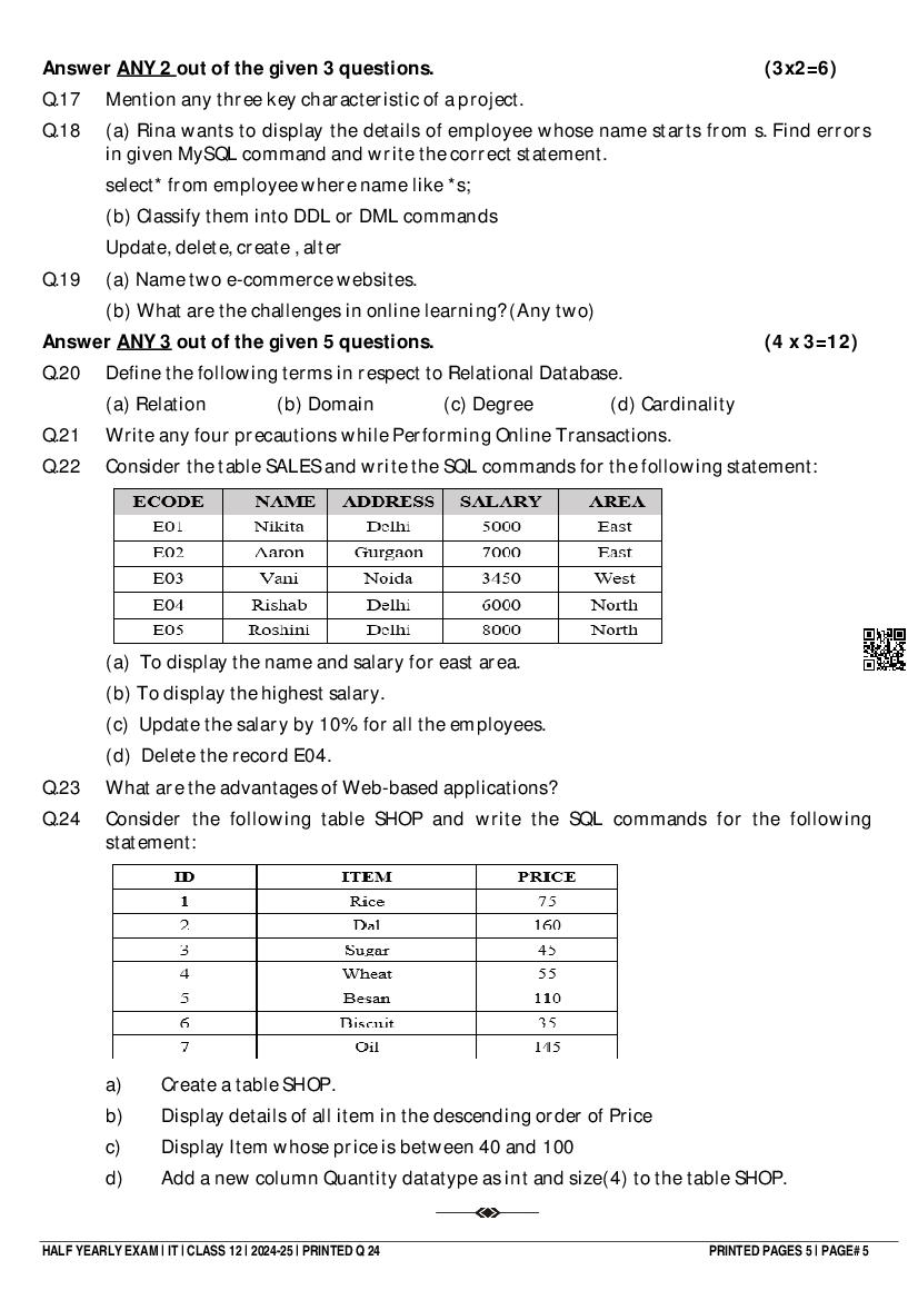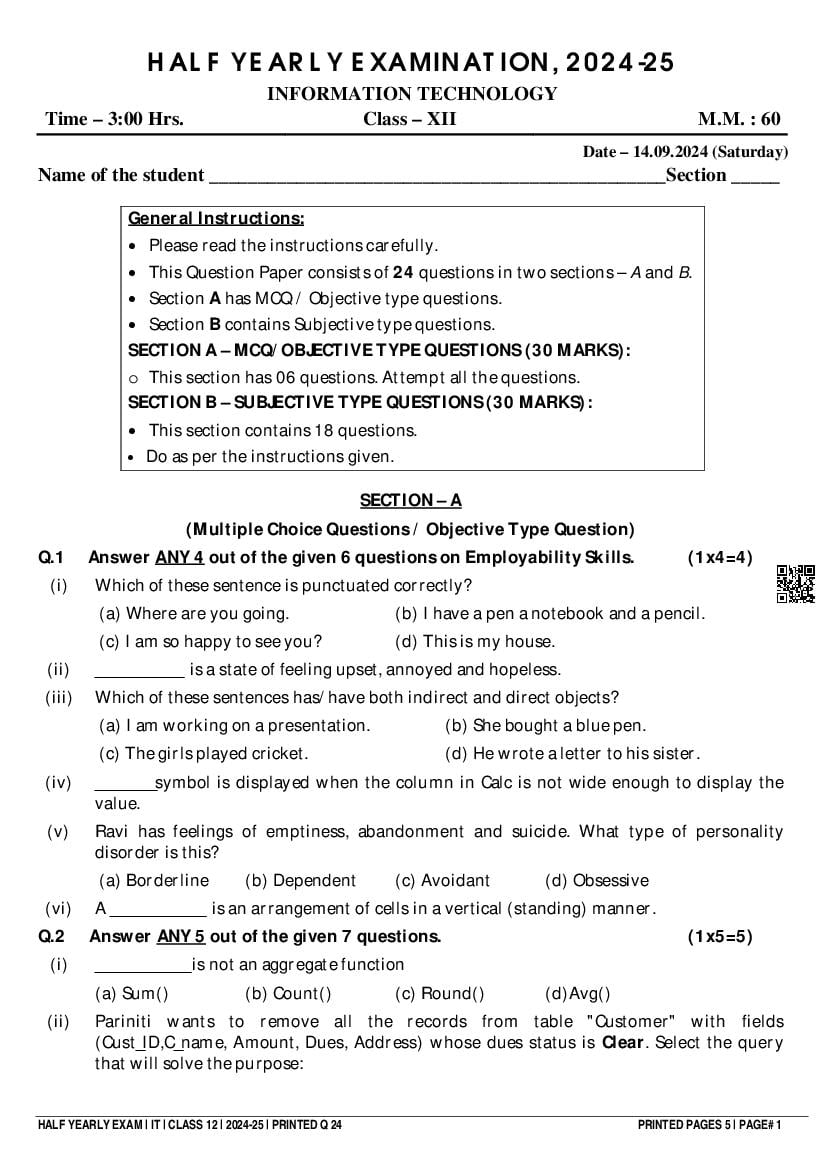 Class 12 Question Paper 2024-25 Information Technology (Half Yearly) View Download