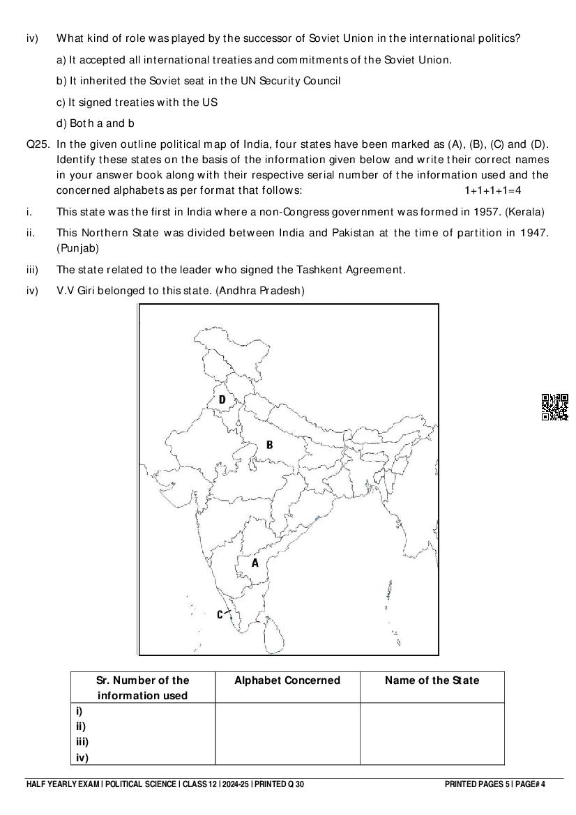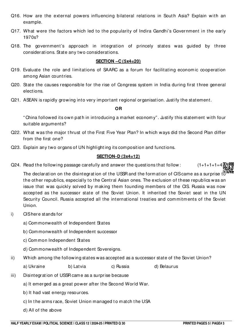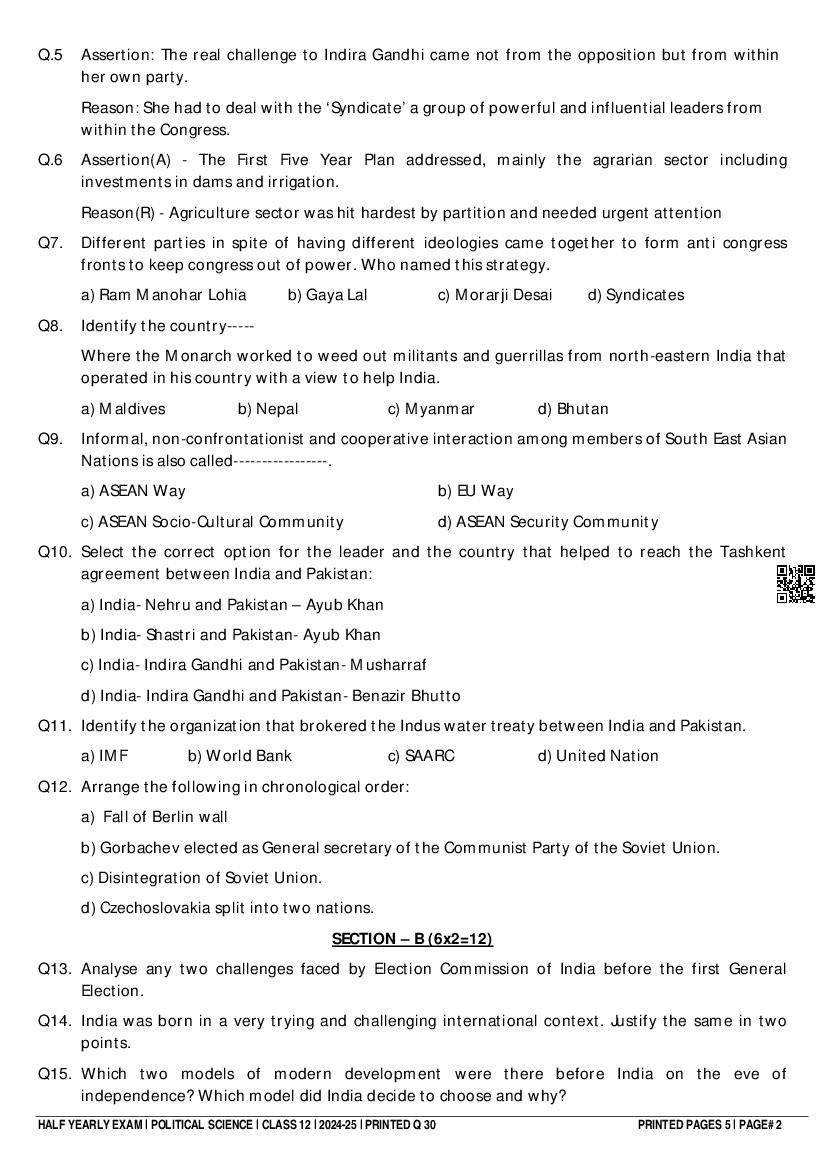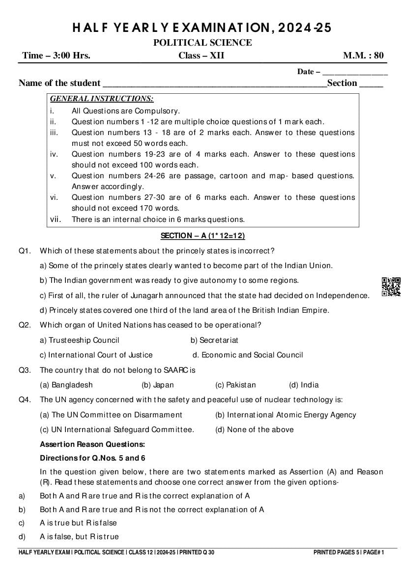 Class 12 Political Science Half Yearly Question Paper 2025 PDF