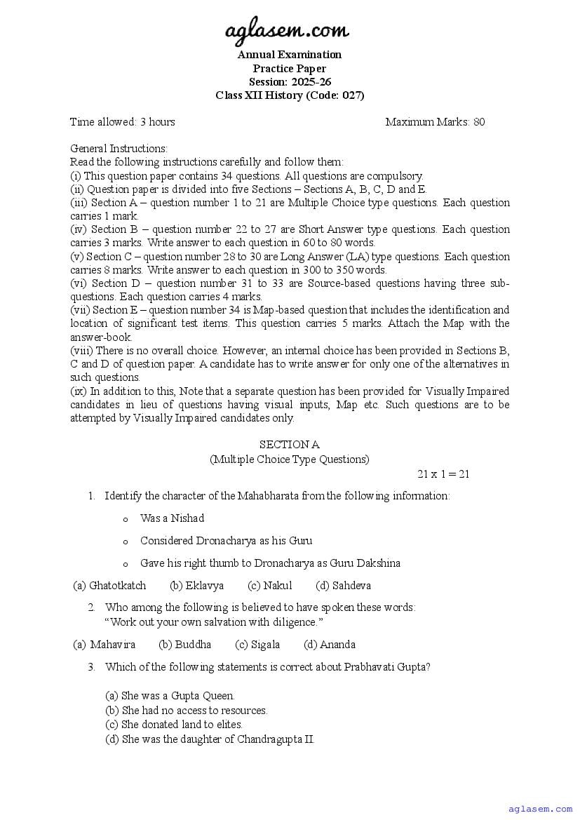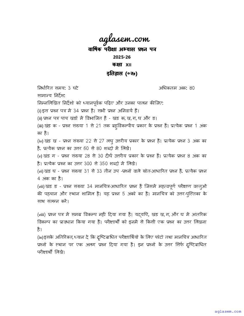 Class 12 History Sample Paper 2026 is now available! If you are currently in class 12 and preparing for your annual or final exams, don’t miss the opportunity to download the History sample paper PDF from aglasem.com. This comprehensive sample paper is designed specifically for class 12 and includes a variety of questions covering the entire History syllabus for class 12th. By practicing these questions, you’ll be well-equipped to achieve excellent marks in your class 12 yearly exams!