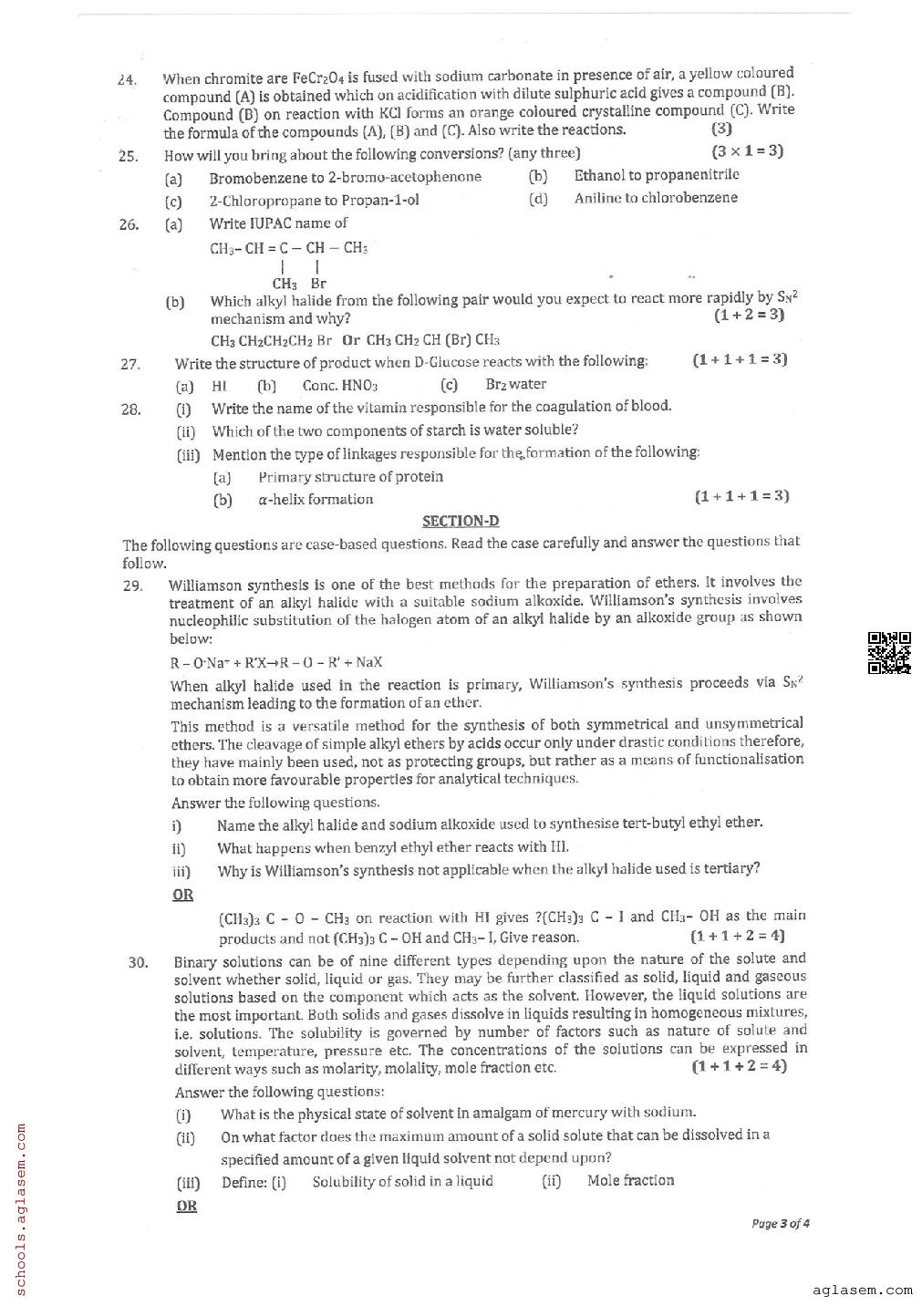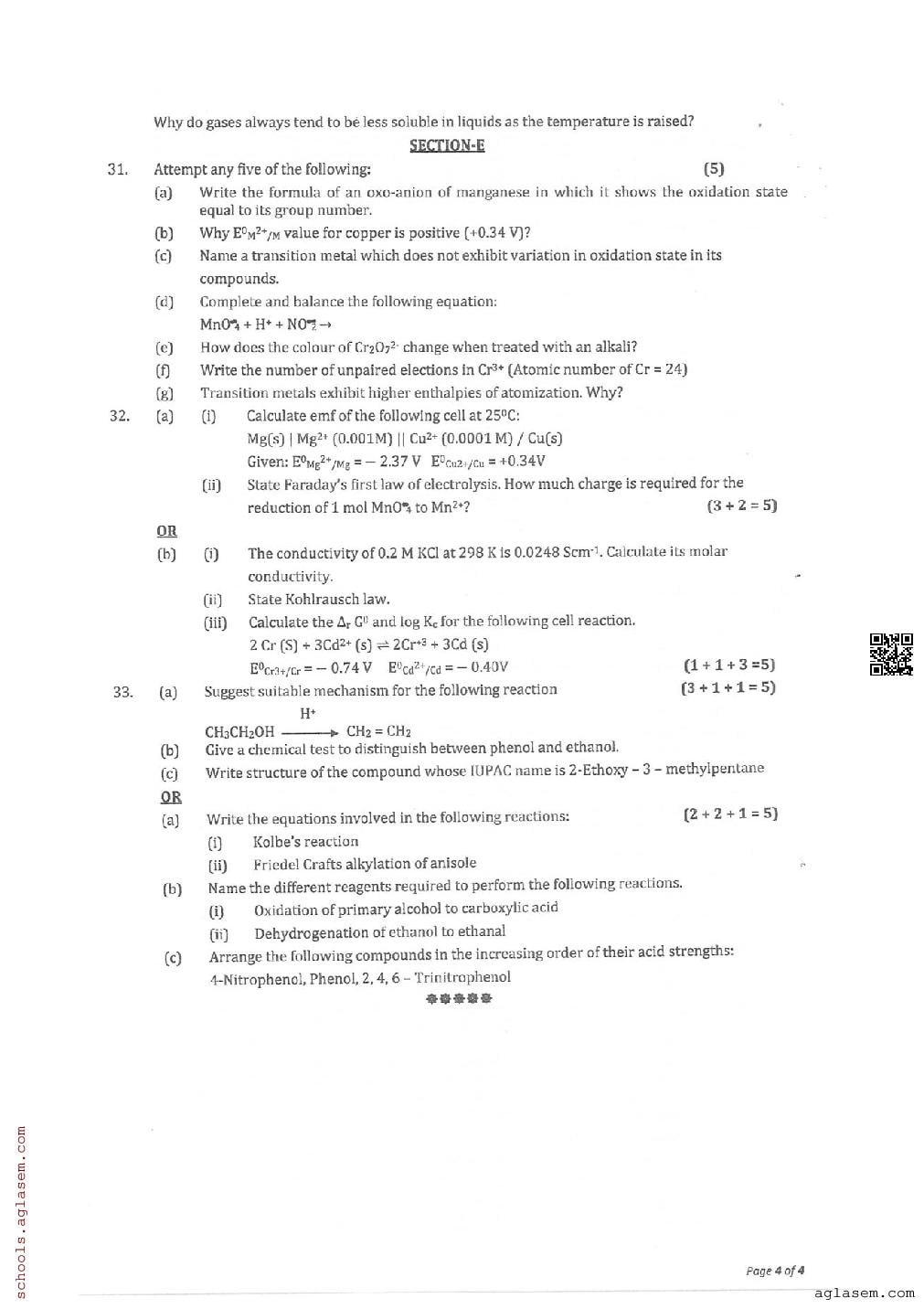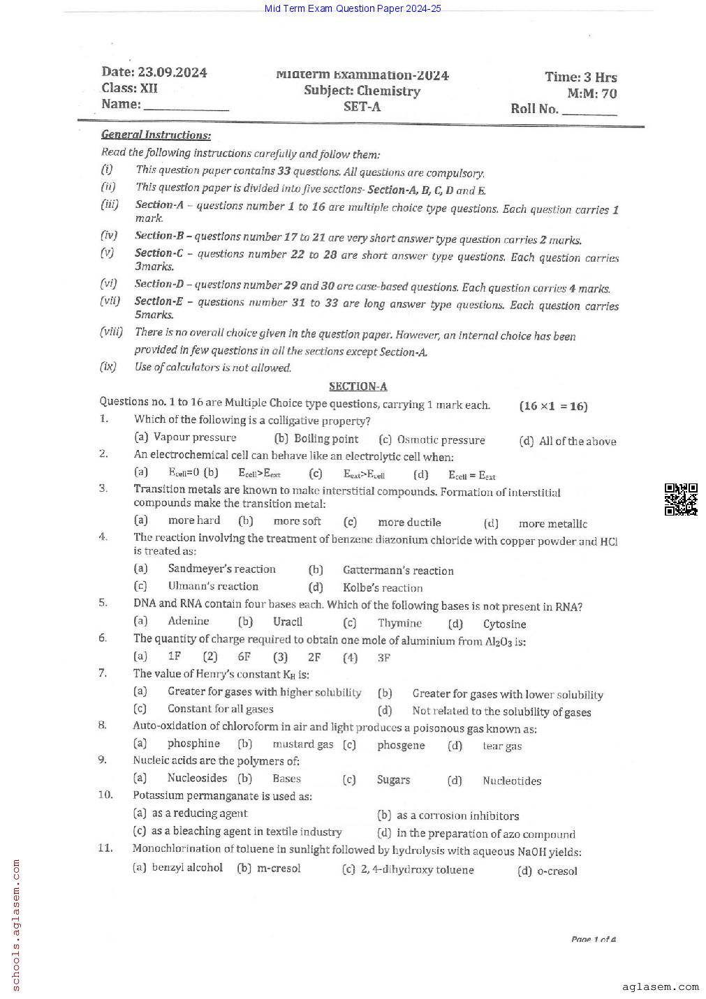 You can easily download the Class 12 Chemistry Mid Term Question Paper PDF from aglasem. The paper is prepared based on the latest syllabus and gives a clear idea of the type of questions asked in the exam. The mid term exam question paper for 12th std for Chemistry subject is as follows.
