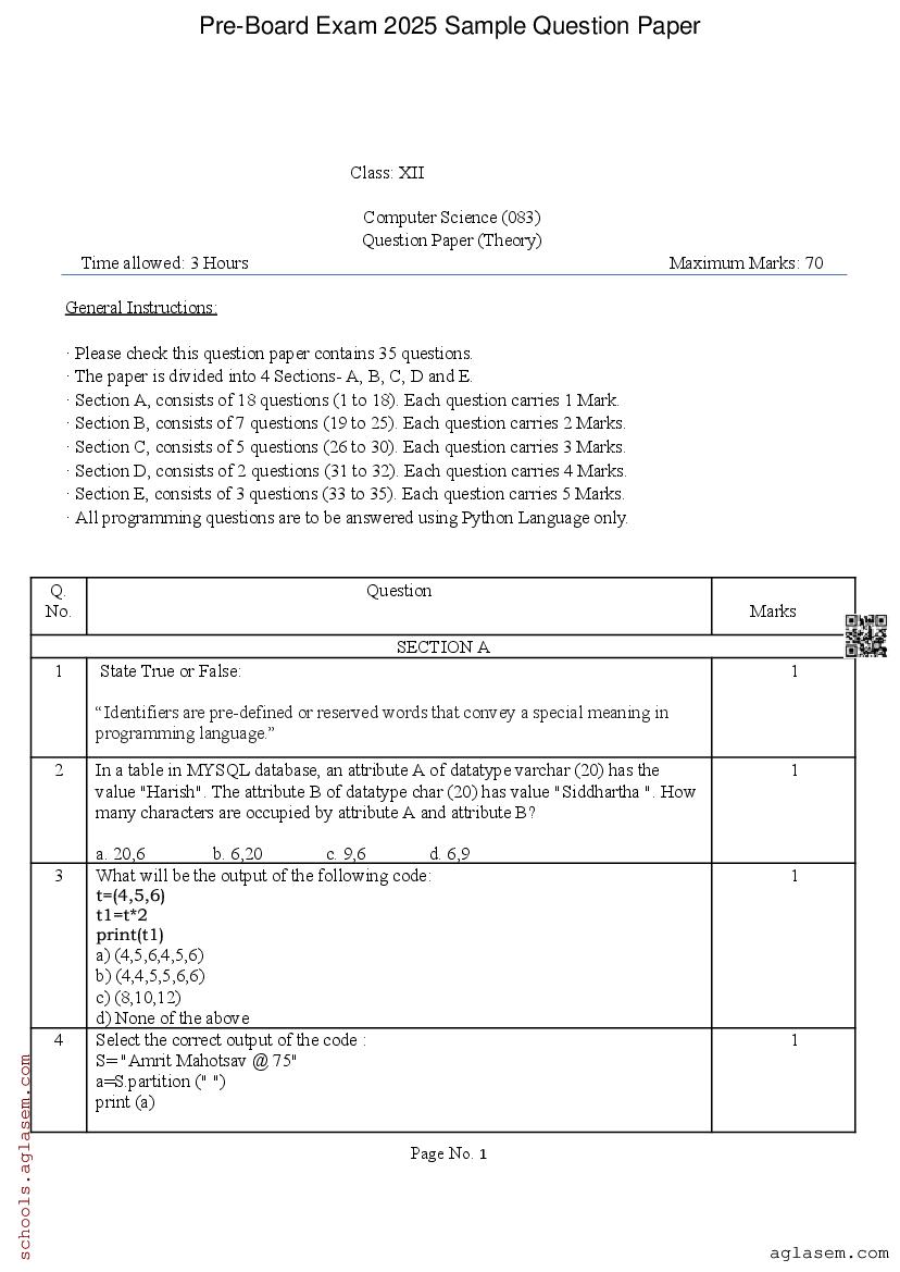 The class 12 sample paper for pre-board exam, for Computer Science subject, is as follows.