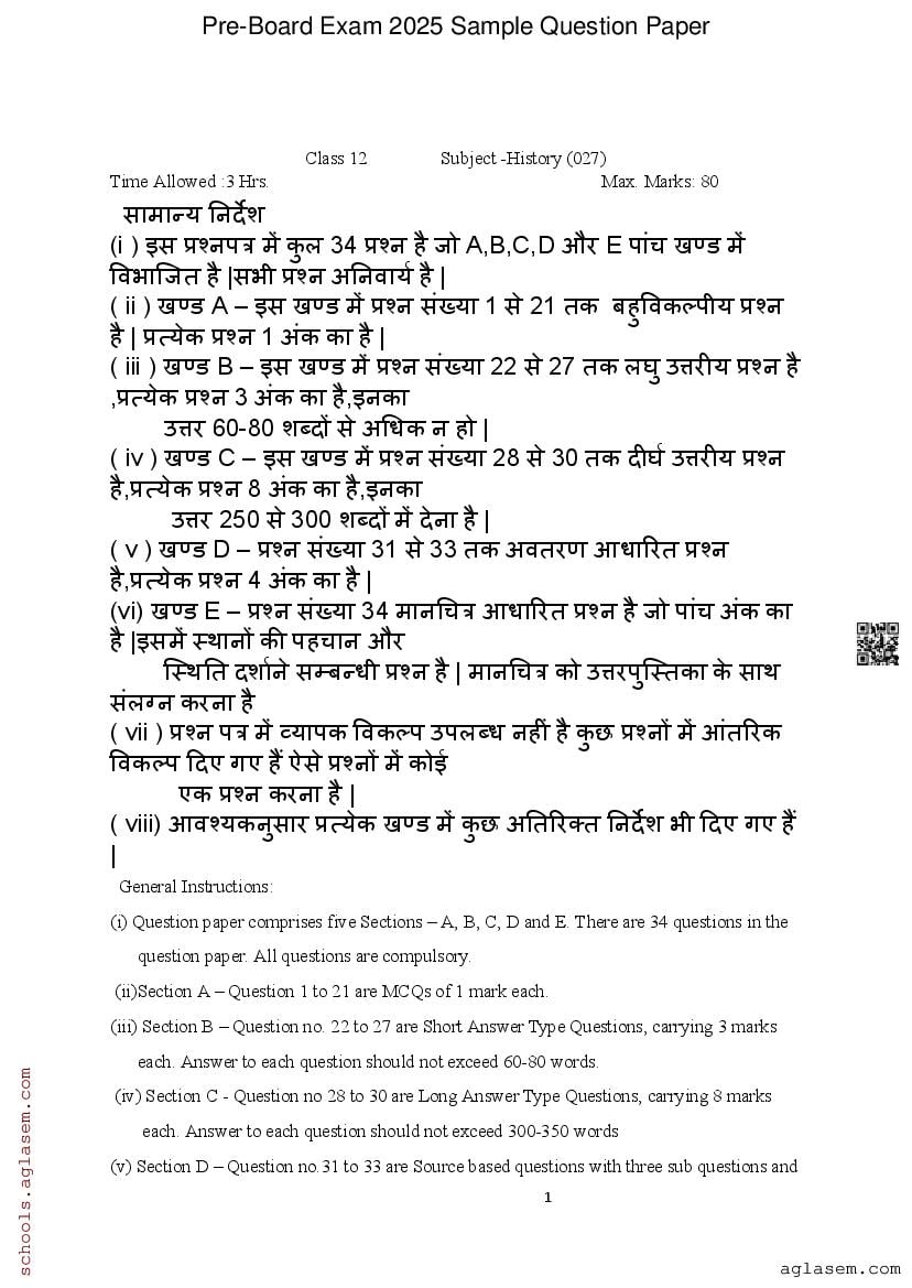 The class 12 sample paper for pre-board exam, for History subject, is as follows.