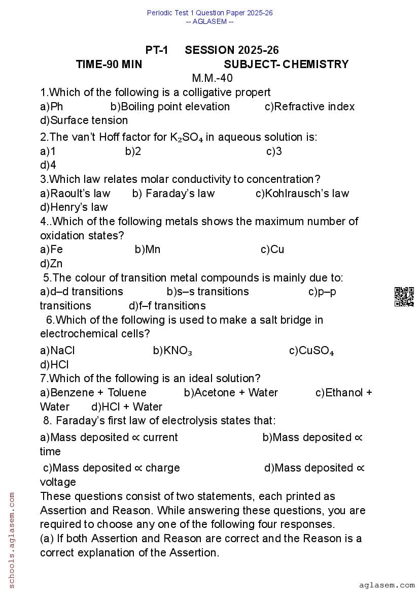 The Class 12 PT 1 Question Paper Chemistry 2025-26 PDF is is made available here by aglasem for your exam preparation. You can download the Class 12 PT I Chemistry Question Paper PDF from here on aglasem.com to prepare for this crucial exam. It is important to solve this Chemistry question paper, along with other Class 12 PT Question Paper if you are a student in the 12th grade, as it helps you understand the pattern and type of questions you will face in your upcoming periodic test exams. The Chemistry Periodic Test 1 Question Paper is designed to test the student’s understanding of various Chemistry concepts taught in the first term. Here, you will know everything about the Class 12 PT 1 Chemistry Question Paper, including tips, sample questions, and resources for effective preparation.