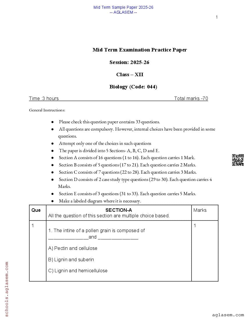 Get the Class 12 Biology Mid Term Sample Paper 2025 for your school mid term examination. These Class 12 Biology Mid Term Sample Paper 2025 for are developed by experts based on NCERT syllabus. You can now download the Class 12 Biology Mid Term Model Question Paper PDF here at aglasem. This class 12 mid term sample paper for Biology contains specimen questions from the latest class 12 Biology syllabus and gives you a good idea of what to expect in Biology paper in periodic tests, unit tests or term 1 examination. Therefore, by solving the Biology sample paper, you can aim for better marks in class 12 periodic test.