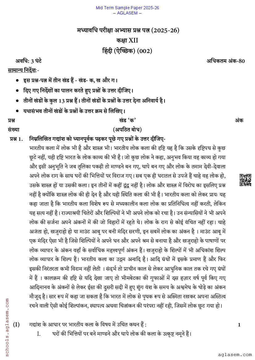 You can view and download Sample Paper for Standard 12 Mid-Term Exam 2025 for Hindi subject from aglasem.