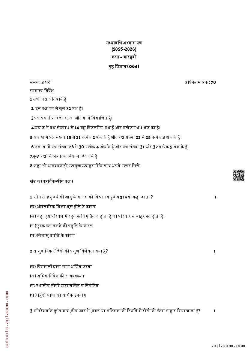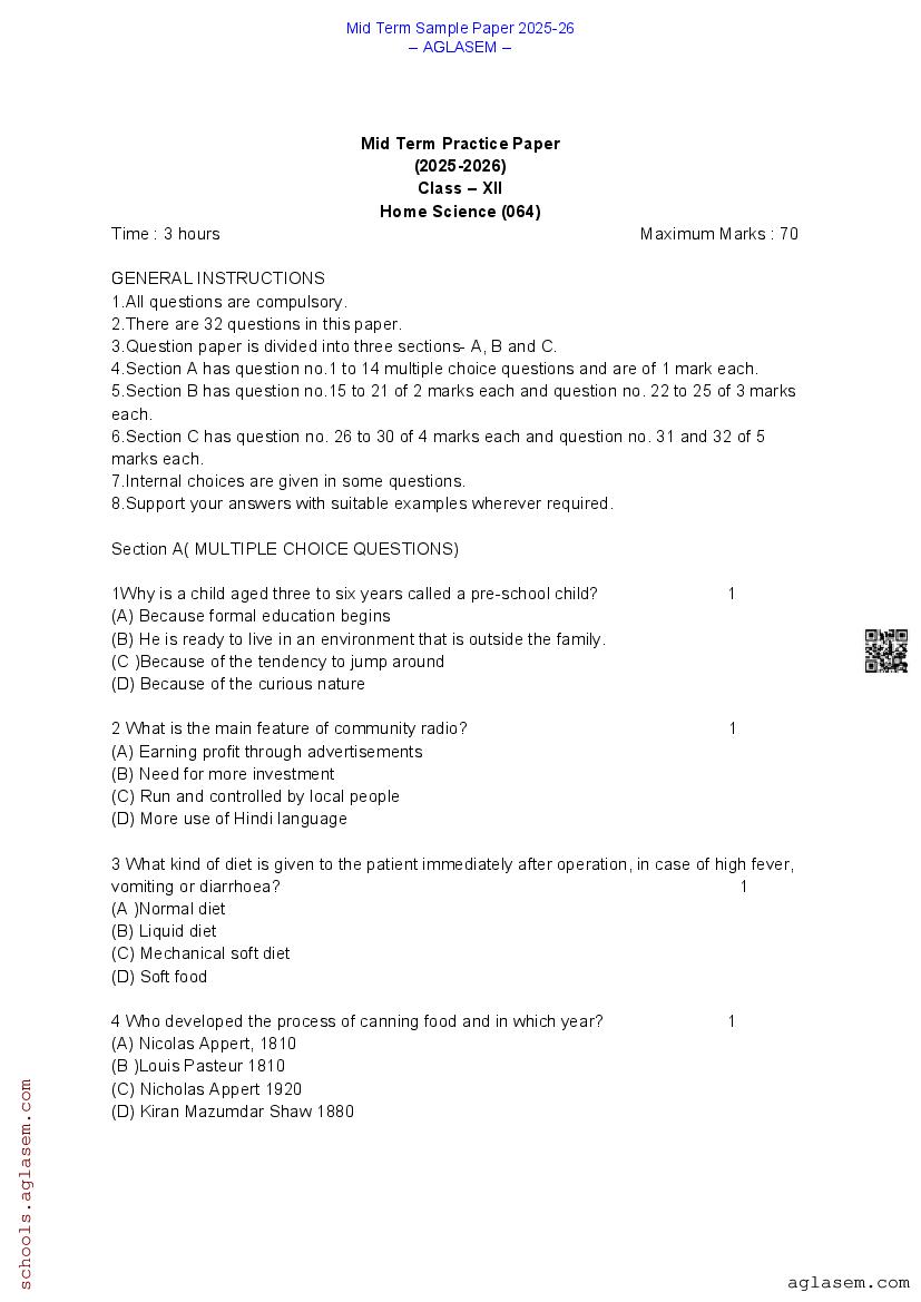 You can view and download Sample Paper for Standard 12 Mid-Term Exam 2025 for Home Science subject from aglasem.