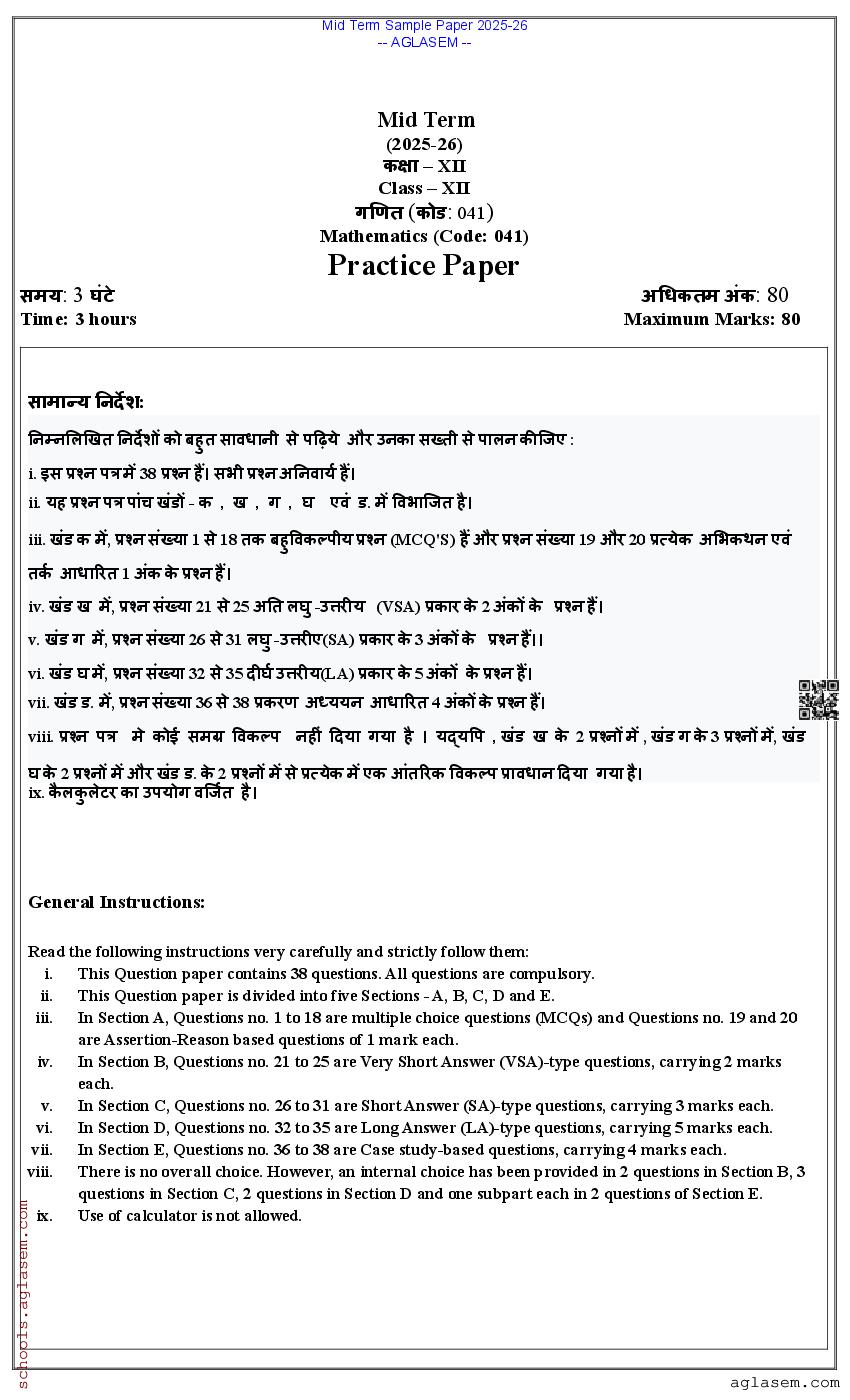 You can view and download Sample Paper for Standard 12 Mid-Term Exam 2025 for Math subject from aglasem.