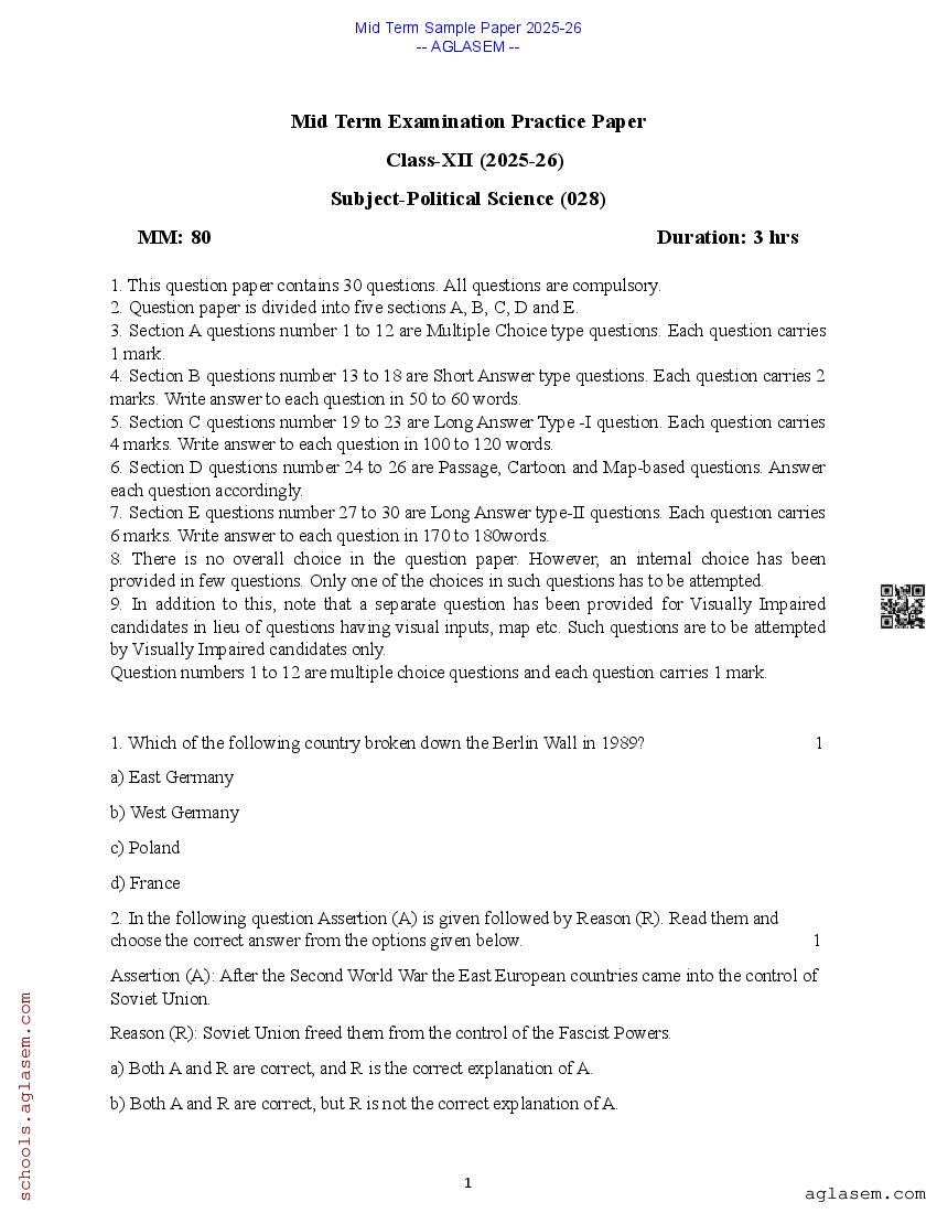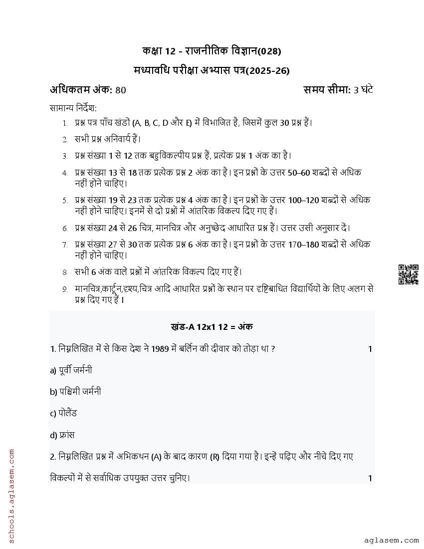 Get the Class 12 Political Science Mid Term Sample Paper 2025 for your school mid term examination. These Class 12 Political Science Mid Term Sample Paper 2025 for are developed by experts based on NCERT syllabus. You can now download the Class 12 Political Science Mid Term Model Question Paper PDF here at aglasem. This class 12 mid term sample paper for Political Science contains specimen questions from the latest class 12 Political Science syllabus and gives you a good idea of what to expect in Political Science paper in periodic tests, unit tests or term 1 examination. Therefore, by solving the Political Science sample paper, you can aim for better marks in class 12 periodic test.