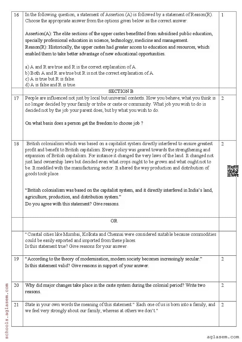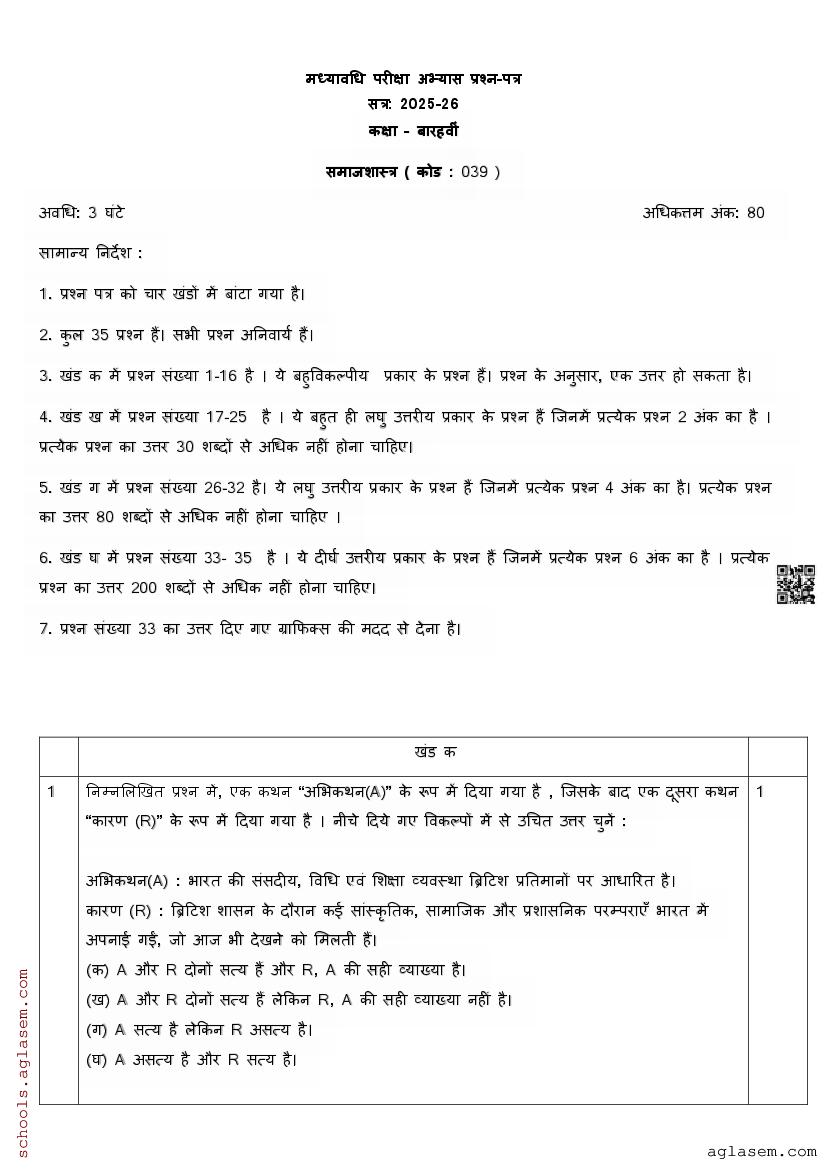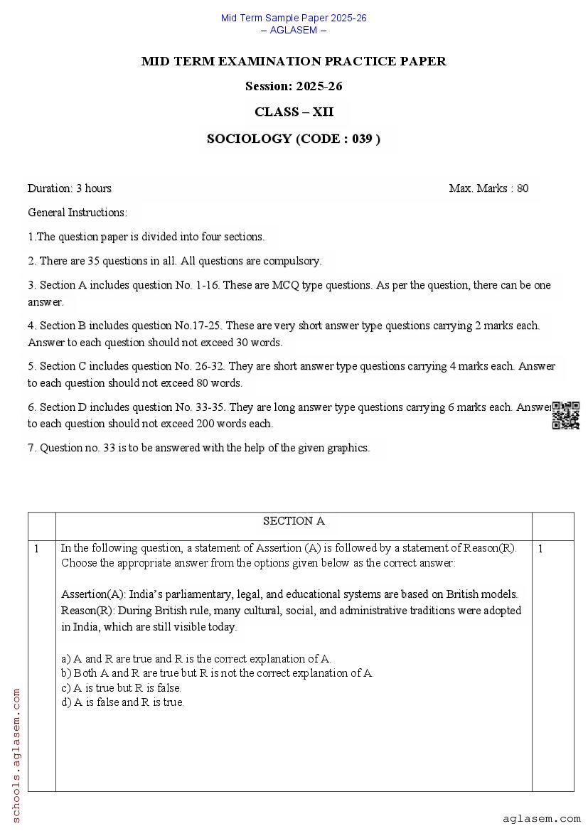 You can view and download Sample Paper for Standard 12 Mid-Term Exam 2025 for Sociology subject from aglasem.